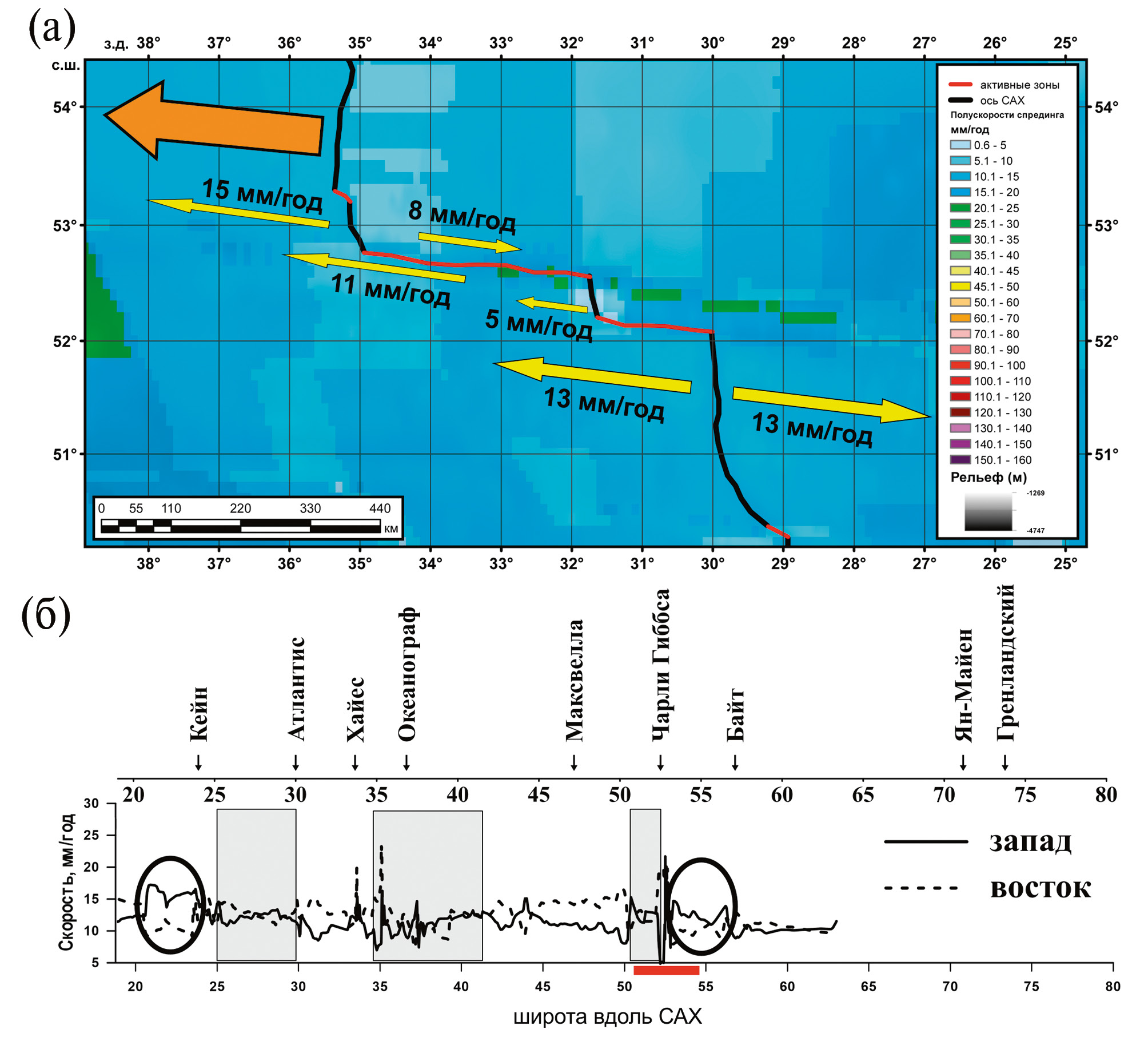 Двукратная асимметрия полускоростей спрединга (рис. 2 а) позволяет предположить, что может иметь место дрейф блока Северо-Американской плиты на запад вместе со структурой САХ, сопровождающийся перескоком осей его сегментов на запад. Признаки этого процесса читаются по распределению сейсмичности (см. рис. 1 а) и по рельефу дна [14]. Несмотря на правосдвиговую кинематику смещения плит, примыкающих к северному трогу ЧГ, указанная асимметрия может создать вдоль него локальные условия для левого сдвига и образования впадины пулл-апарт (см. рис. 1 б). Значения полускоростей спрединга (мм/год) вдоль изохроны 4 млн лет, показанные парой для западного и восточного флангов САХ, построенные по данным [8], отображены на рис. 2 б. Из этих данных следует, что в Северной Атлантике в целом наблюдается асимметрия полускоростей с превышением значений на восточном фланге САХ [13]. Есть несколько сегментов, где асимметрия практически исчезает (см. рис. 2 б), которые увязаны в работе [13] с наличием ответвлений суперплюмов под осью САХ. Но наибольший интерес представляют области, где имеет место инверсия асимметрии полускоростей (см. рис. 2 б), и значения на западном фланге превышают значения на восточном. Одним из таких сегментов является область непосредственно к северу от ЧГ, и, по всей видимости, это создаёт условия формирования локальной левосдвиговой кинематики вдоль северного трога ЧГ.