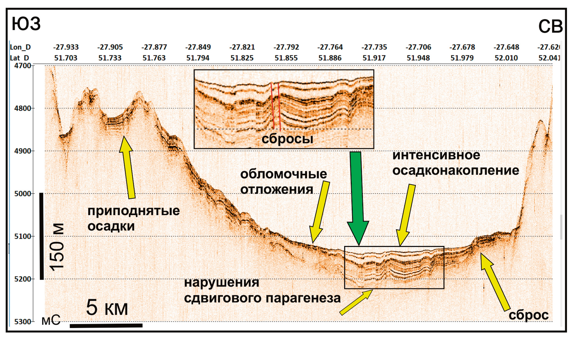 Рис. 4. Фрагмент сейсмоакустического разреза ANS53-50 на пересечении северного трога разлома Чарли Гиббс, полученный профилографом EdgeTech 3300 с сигналом типа CHIRP в диапазоне частот от 2 до 5 кГц. Положение фрагмента приведено на рис. 1. Пояснения элементов, указанных стрелками, даны в тексте.