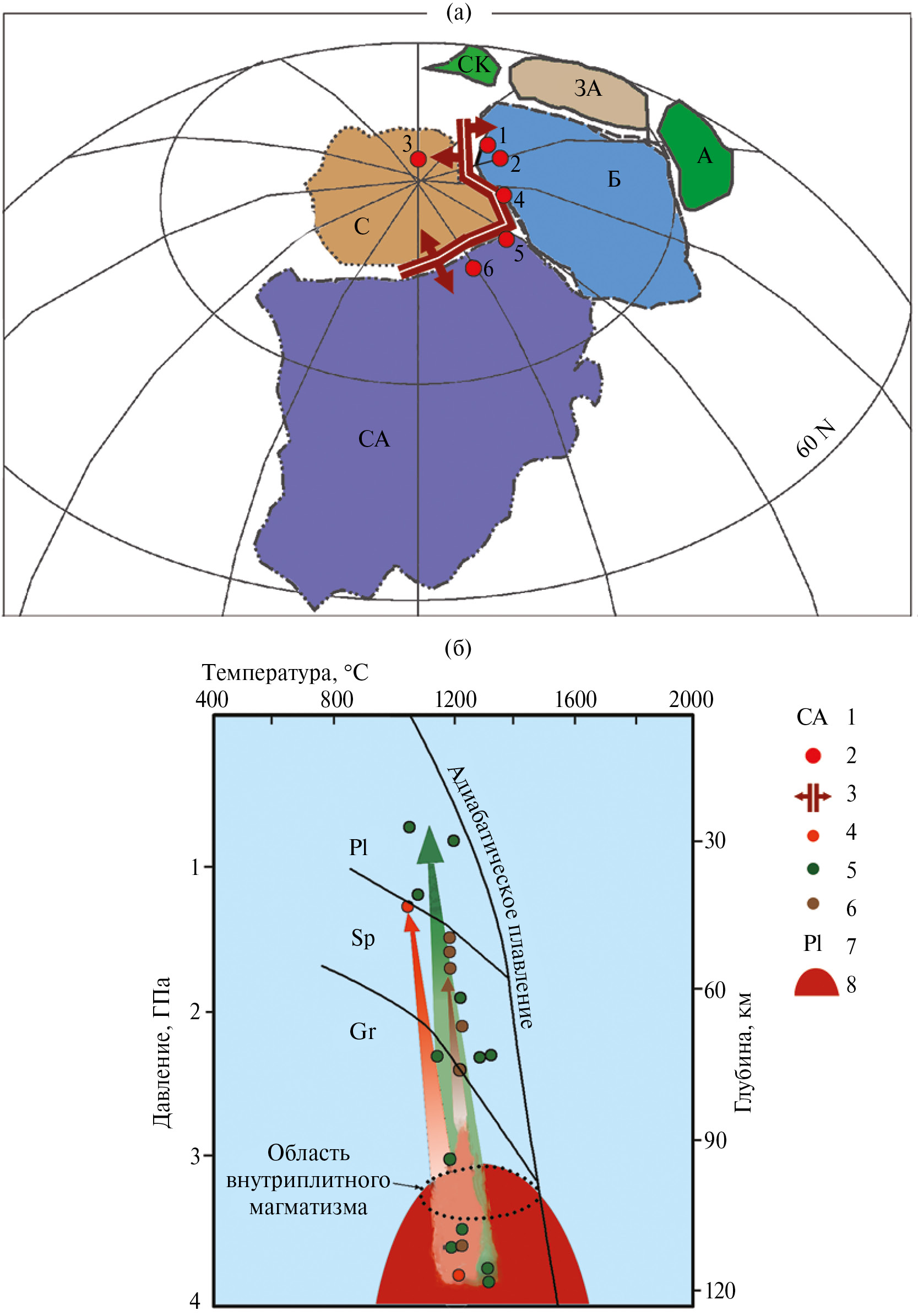 Рис. 3. Среднерифейские (1380–1385 млн лет) магматические комплексы на реконструкции континента Нуна (Колумбия), по [17] с упрощениями (а) и PT-диаграмма для расплавов, сформировавших магматические комплексы западного склона Южного Урала, по [18] с упрощениями (б). а: 1 — СА — Северная Америка, С — Сибирия, Б — Балтика, А — Амазония, ЗА — Западная Африка, СК — Северо-Китайская платформа; 2 — рифтовая зона с машакским возрастом; 3 — индикаторные магматические комплексы (1 — Машак, 2 — дайки в скв. Мензелино-Актаныш, 3 — Анабар, дайки Чирес, 4 — Тиман, скв. Полью-1, 5 — Гренландия, вулканиты Мидсоммерсо и Зиг-Зал Вал, 6 — дайки Виктория Лэнд). б: 4 — мисаелгинский комплекс; 5 — ишлинский комплекс; 6 — лысогорский комплекс; 7 — поля устойчивости минеральных фаз (Pl — плагиоклаз, Sp — шпинель, Gr — гранат); 8 — предполагаемый плюм.