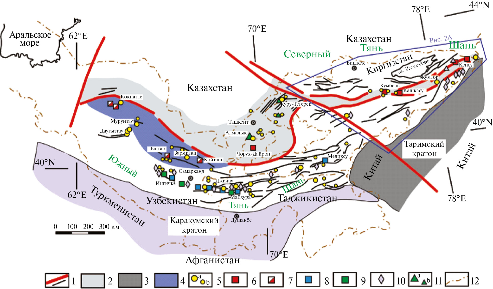 Рис. 1. Схема позднепалеозойского металлогенического пояса Тянь-Шаня. 1 — разломы разных порядков, 2 — позднепалеозойская активная континентальная окраина (Срединный Тянь-Шань), 3 — континентальные блоки основания Таримского и Каракумского кратонов, 4 — террейны аккреционного клина, надвинутые на пассивную континентальную окраину с возможным кратонным фундаментом, 5 — главные (а) и второстепенные (b) месторождения золота, 6 — золото-медно-молибден-вольфрамовые месторождения, 7 — молибден-вольфрамовые месторождения, 8 — полиметально-вольфрамовые месторождения, 9 — олово-вольфрамовые месторождения, 10 — месторождения олова, 11 — главные (а) и второстепенные (b) медно-молибденовые и молибден-золото-медные порфировые месторождения, 12 — государственные границы.