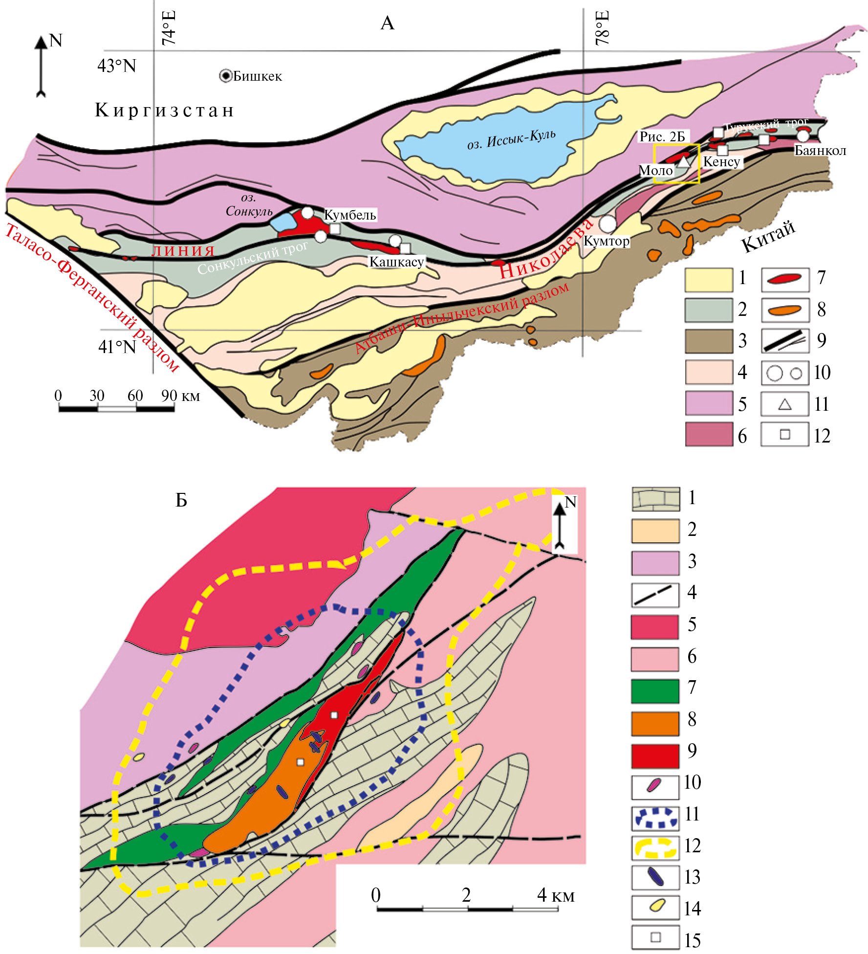 Рис. 2. Геологические схемы (А) Восточного Киргизстана, показывающая позицию “линии В.А. Николаева” и строение прилегающих территорий, и (Б) района Моло-Сарычатского плутона, по [5], с изменениями. А: 1 — кайнозойские отложения, 2 — позднедевонские-раннекаменноугольные сутурные троги (Сонкульский, Турукский), 3 — террейны Южного Тянь-Шаня, 4 — террейны Срединного Тянь-Шаня, 5 — террейны Северного Тянь-Шаня, 6 — палеопротерозойские (до архейских?) гнейсы, амфиболиты, мигматиты (блоки основания Таримского кратона, отчленённые по системам рифтов), 7 — позднекаменноугольные-раннепермские интрузивы шошонитовой и высококалиевой известково-щелочной серий, 8 — отдельные позднекаменноугольные-пермские гранитоидные интрузивы Южного Тянь-Шаня, 9 — разломы, 10–12 — месторождения и рудопроявления (10 — золота, 11 — вольфрама, 12 — молибдена). Б: 1 — верхнедевонские-нижнекаменноугольные доломиты, известняки, подчинённые сланцы и песчаники, 2 — верхненеопротерозойские до кемрийских сланцы, конгломераты, тиллиты, 3 — неопротерозойские сланцы, доломиты, известняки, 4 — разломы, 5 — ордовикские-силурийские гранитоиды (Сусамырский комплекс), 6 — неопротерозойские (?) гранитоиды (Сарыджазский комплекс), 7-9 — позднекаменноугольные-раннепермские интрузивы шошонитовой и высококалиевой известково-щелочной серий (7 — монцодиориты, включая гибридные кварцевые монцодиориты, 8 — кварцевые монцониты, 9 — монцограниты), 10-14 — гидротермальные метасоматиты и рудная минерализация (10 — измененные скарны с W-, Mo-, Cu-минерализацией, 11 — ареал развития калиевых метасоматитов и филлизитов с Mo-, Cu-, W-минерализацией, 12 – ареал развития филлизитов (кварц-серицитовых и кварц-карбонат-серицитовых метасоматитов) с Pb-, Zn-, Bi-, Ag-, Au-минерализацией, 13 — зоны интенсивного кварцевого прожилкования с Mo- и Cu-минерализацией, 14 — зоны интенсивного прожилкования с Pb-, Zn-, Bi-, Ag-, Au-минерализацией), 15 — места отбора проб для изотопного датирования цирконов.