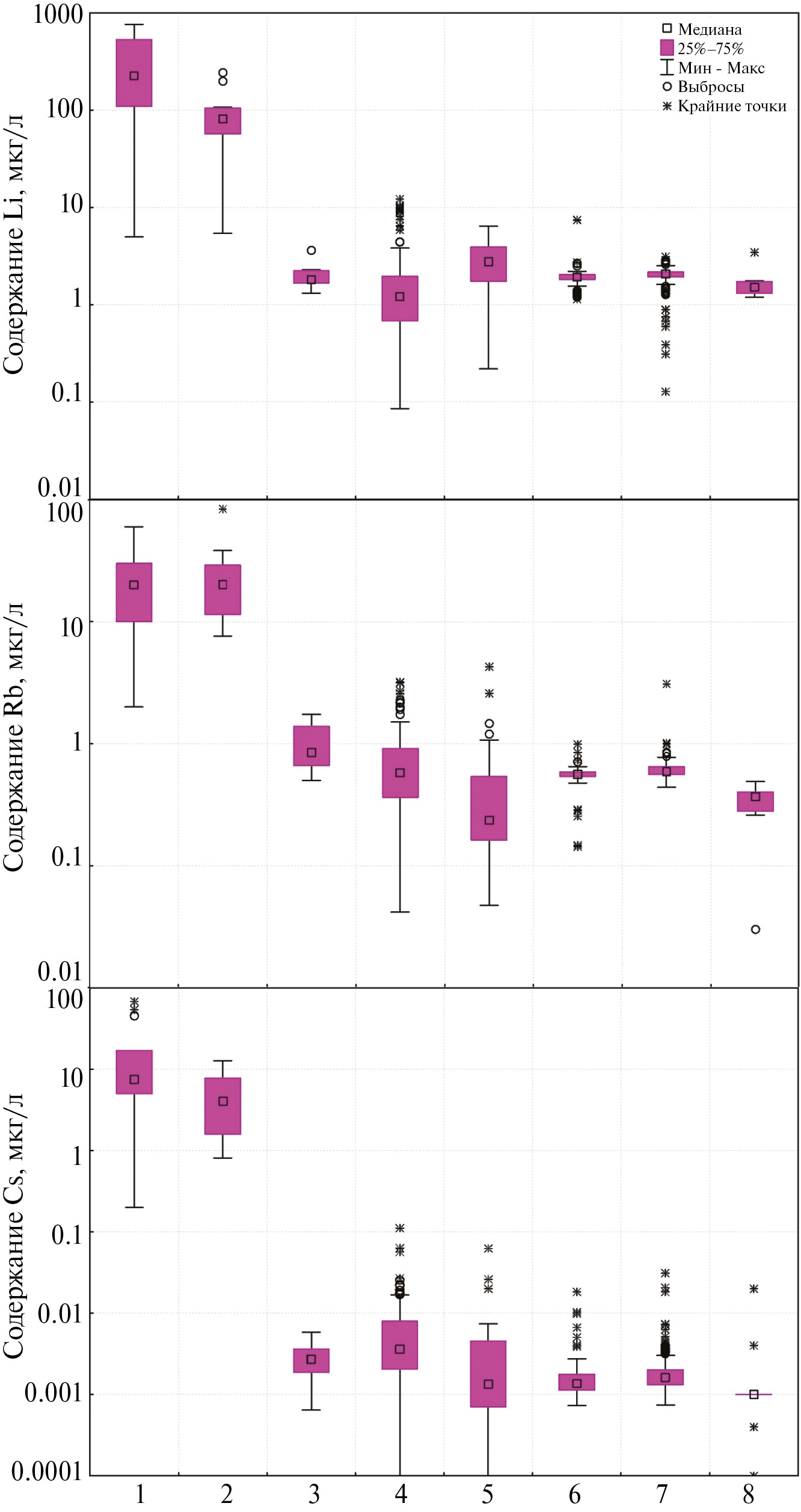 Поверхностная и глубинная вода Байкала. Анализ редких щелочей в поверхностной и глубинной воде Байкала выявил отсутствие резких различий в их концентрациях, что нашло отражение в удивительно компактных блок-диаграммах (большинство значений находится в пределах 25–75%) их распределения (рис. 2–4).