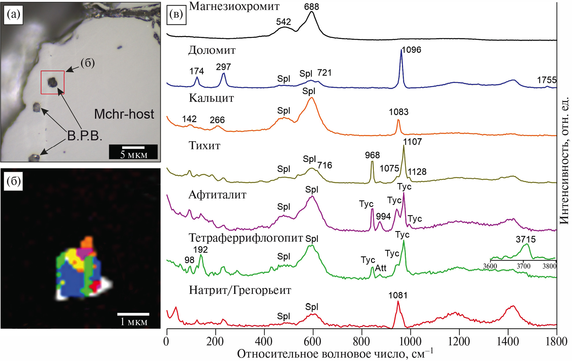 Рис. 2. (а) группа вторичных расплавных включений (В.Р.В.) в залеченной трещине в зерне породообразующего магнезиохромита (Mhcr-host), фотография в отражённом свете. Красный прямоугольник на рисунке (а) ограничивает площадь рисунка (б). (б) КР-карта распределения фаз во вторичном расплавном включении. (в) КР-спектры минерала-хозяина и дочерних минералов в этом включении. Цвет КР-спектров на рисунке (в) соответствует цвету фаз на карте (б).