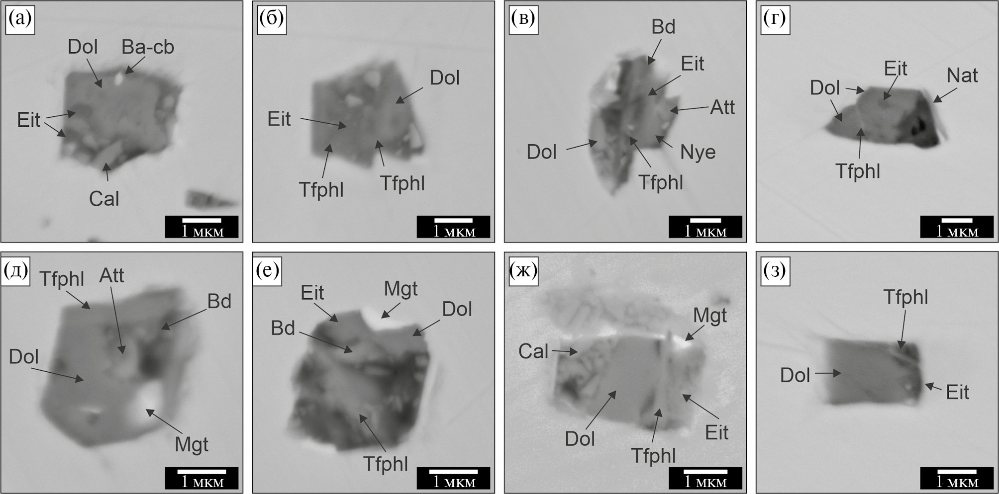 Состав породообразующей Cr-шпинели ксенолита G1-25, соответствует магнезиохромиту (табл. 1). Породообразующий магнезиохромит (FeOt 18.86 мас. %; Al2O3 15.09 мас. %) ксенолита G1-25 содержит залеченные трещины, маркированные эпигенетическим магнезиохромитом второй генерации (FeOt 19.70 мас. %; Al2O3 14.19 мас. %) (рис. 1 б, табл. 1). В залеченных трещинах были обнаружены вторичные расплавные включения. Всего было изучено 50 включений (см. электронное приложение, табл. 2S). Размер индивидуальных включений не превышает 5 мкм, размер дочерних фаз составляет 0.2–3 мкм (рис. 2 б, 3–4). КР-спектры дочерних минералов включений соответствуют различным карбонатам, сульфату, фосфату и силикату (см. электронное приложение, табл. 3S), EDS-анализы дочерних минералов и карты распределения элементов в расплавных включениях подтверждают результаты КР-спектроскопии, кроме того, методами SEM-EDS среди дочерних фаз дополнительно идентифицированы галит, сильвин и магнетит (табл. 2, рис. 2–4). Анализ КР-карт, BSE-изображений и элементных карт 50 расплавных включений показал, что содержание карбонатов и карбонатов с дополнительными анионами во включениях составляет 77 об. %, силиката (тетраферрифлогопита) – 15 об. %. EDS-анализы относительно крупных кристаллов доломита (преобладающего карбоната во включениях, 50 об.%) показывают, что этот дочерний минерал содержит примесь Na до 0.3 ф.е. Соотношение Ca:Na:K в веществе включений составляет 1.1:1:0.1 в ат. % (среднее по 50 включениям), что свидетельствует о высоких концентрациях щелочей в расплаве, реликтами которого являются включения. В КР-спектрах тетраферрифлогопита не выявлено каких-либо линий, соответствующих колебаниям OH–-группы, кроме линии на 3715 см–1, соответствующей колебаниям OH–-группы в позиции (OH, Cl, F) в структуре тетриферрифлогопита [16]. Это позволяет предполагать, что OH–-группы не входят ни в какие дополнительные позиции, и концентрация воды в изученном дочернем тетрафферифлогопите не превышает максимально возможную её концентрацию, рассчитанную из формулы тетраферрифлогопита, т.е. 4.3 мас. %, а концентрация кремнезёма не превышает 43.3 мас. % (см. электронное приложение 1S). Максимальные концентрации SiO2 и H2O в валовом составе вещества включений могут быть оценены как произведения максимального содержания этих компонентов в дочернем тетраферрифлогопите на установленное объёмное содержание тетрафферрифлогопита во включениях (15 мас. %) и составляют ~6 мас. % SiO2 и ~0.6 мас. % H2O.