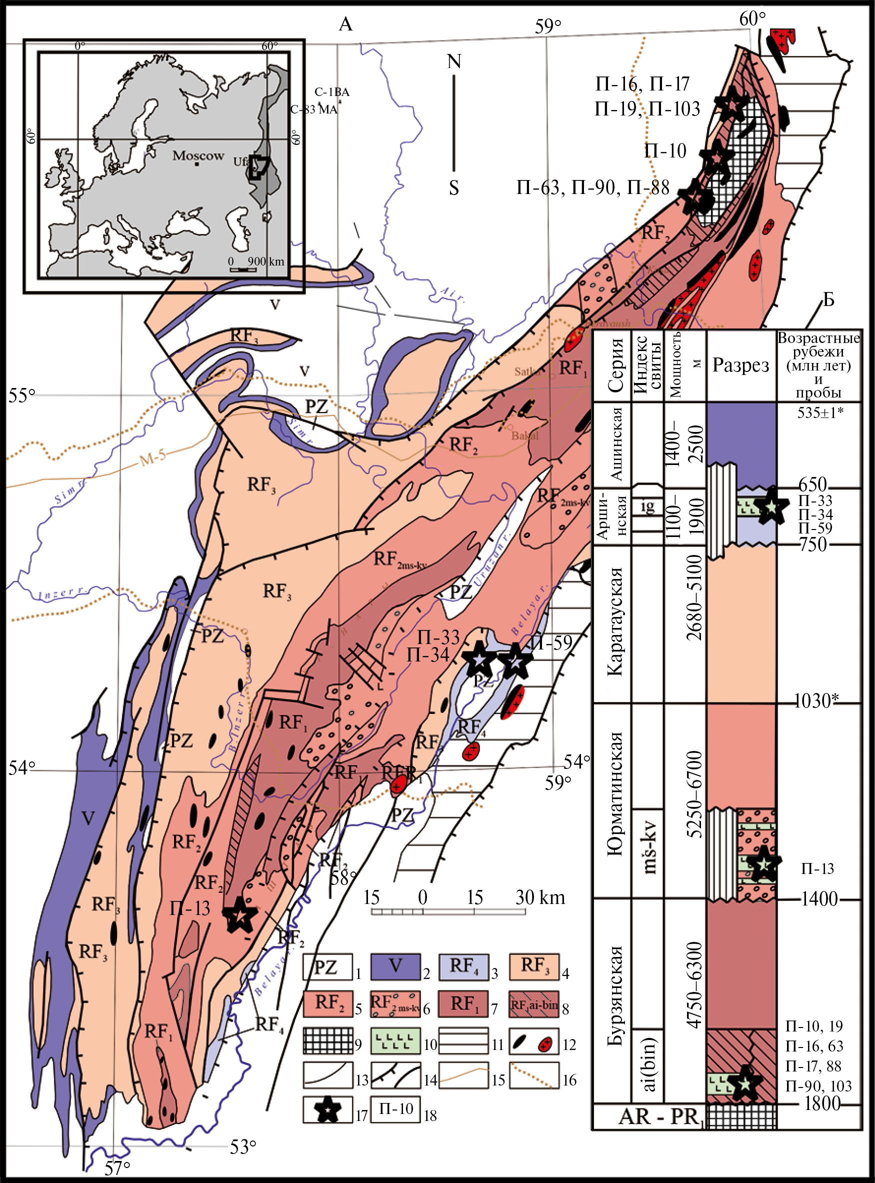 Рис. 1. Геологическая карта (А) и сводный разрез верхнего докембрия (Б) Башкирского мегантиклинория [5]. 1—8 нерасчленённые отложения: 1 — палеозоя, 2 — венда; 3–8 — рифея: 3 —завершающего, 4 — верхнего, 5 — среднего; 6 — машакской и кувашской свит среднего рифея; 7 — нижнего; 8 — айской и большеинзерской свит нижнего рифея; 9 — тараташский комплекс (AR-PR1); 10 — вулканогенные породы основного состава; 11 — метаморфический комплекс Уралтау; 12 — габбродолериты (а) и граниты (б); 13 — границы: стратиграфические; 14 — тектонические нарушения: надвиги, разломы; 15 — автомагистрали; 16 — железные дороги; 17 — местоположение обнажений, из которых отбирались образцы, изученные в этой работе; 18 — номера образцов. Возрастные рубежи (последняя колонка на вкладке) [5] и 1030* [6].