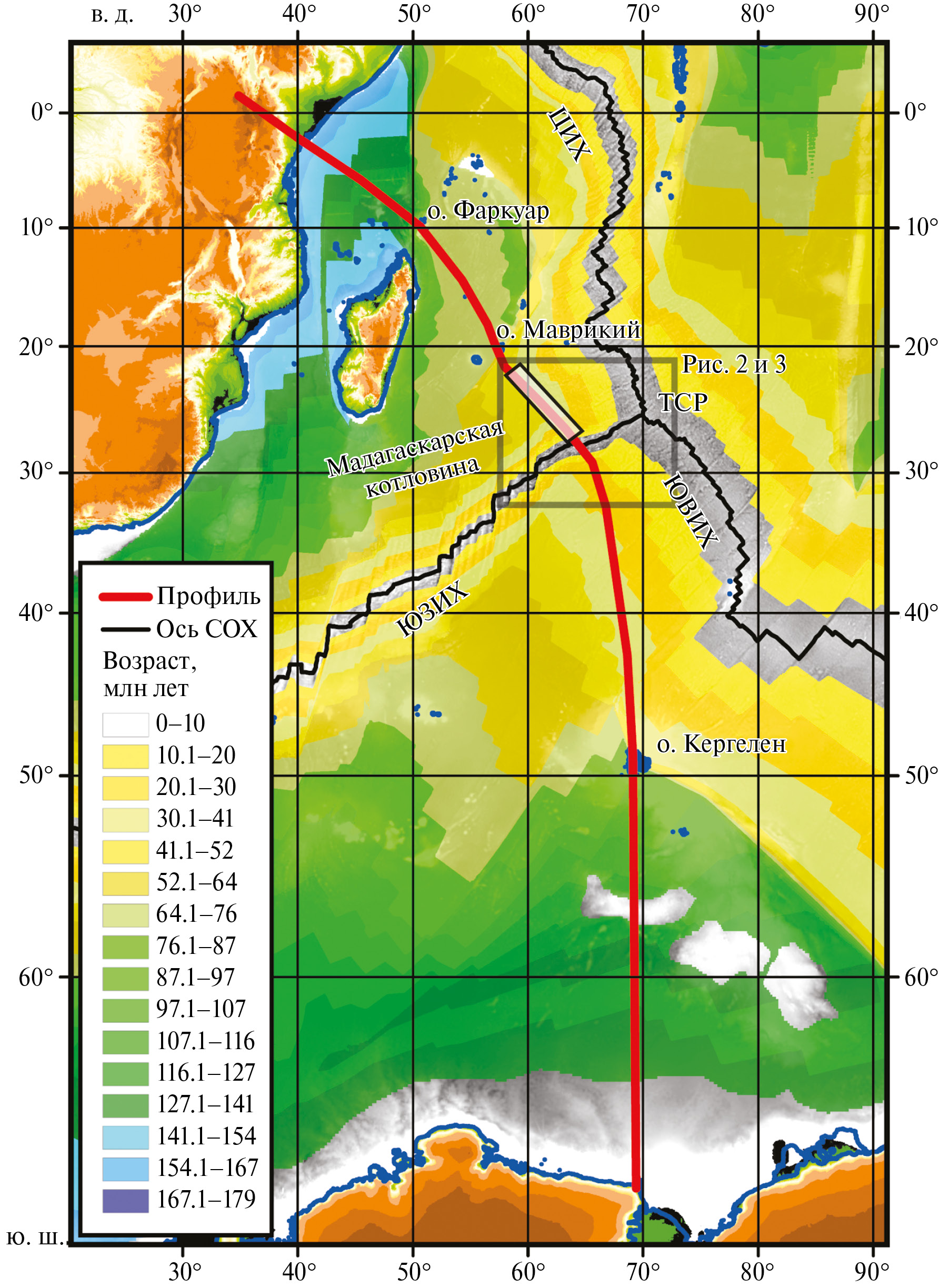 Рис. 1. Положение регионального профиля с сейсмотомографическим разрезом рис. 5-5. и возраст фундамента по данным [5]. Возрастной интервал 0–10 млн лет показан прозрачным. Рельеф показан по данным [9] в оттенках серого цвета для океанической области. Светлым прямоугольником показано положение полигона “Маврикий” 29-го рейса НИС “Академик Николай Страхов” (ГИН РАН, 2012—2013). Серым прямоугольником показаны рамки планшета рис. 2 и 3. ЮЗИХ — Юго-Западный Индийский хребет; ЮВИХ — Юго-Восточный Индийский хребет; ЦИХ — Центральный Индийский хребет; ТСР — тройное сочленение Родригес.