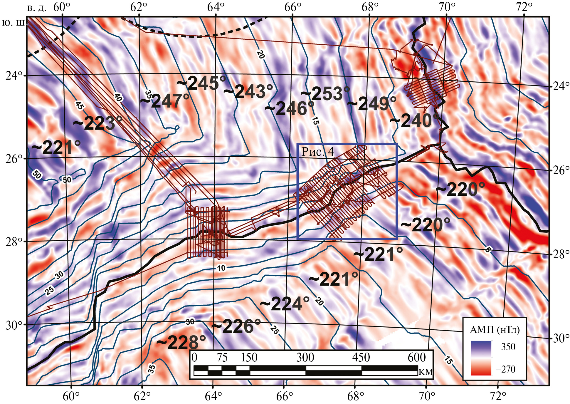 Рис. 2. Аномальное магнитное поле (АМП) восточной части ЮЗИХ по данным [6]. Изолинии с цифрами – возраст фундамента (млн лет) по данным [5]. Линии: коричневые — маршрут 29-го рейса НИС “Академик Николай Страхов” (ГИН РАН, 2012—2013); чёрная утолщённая — оси хребтов; чёрная пунктирная — 200-мильная экономическая зона. Цифрами показаны значения азимутов спрединговой акреции коры в современных координатах в пятимиллионных интервалах, рассчитанные по матрице возрастов [5]. Синим прямоугольником показано положение планшета на рис. 4.