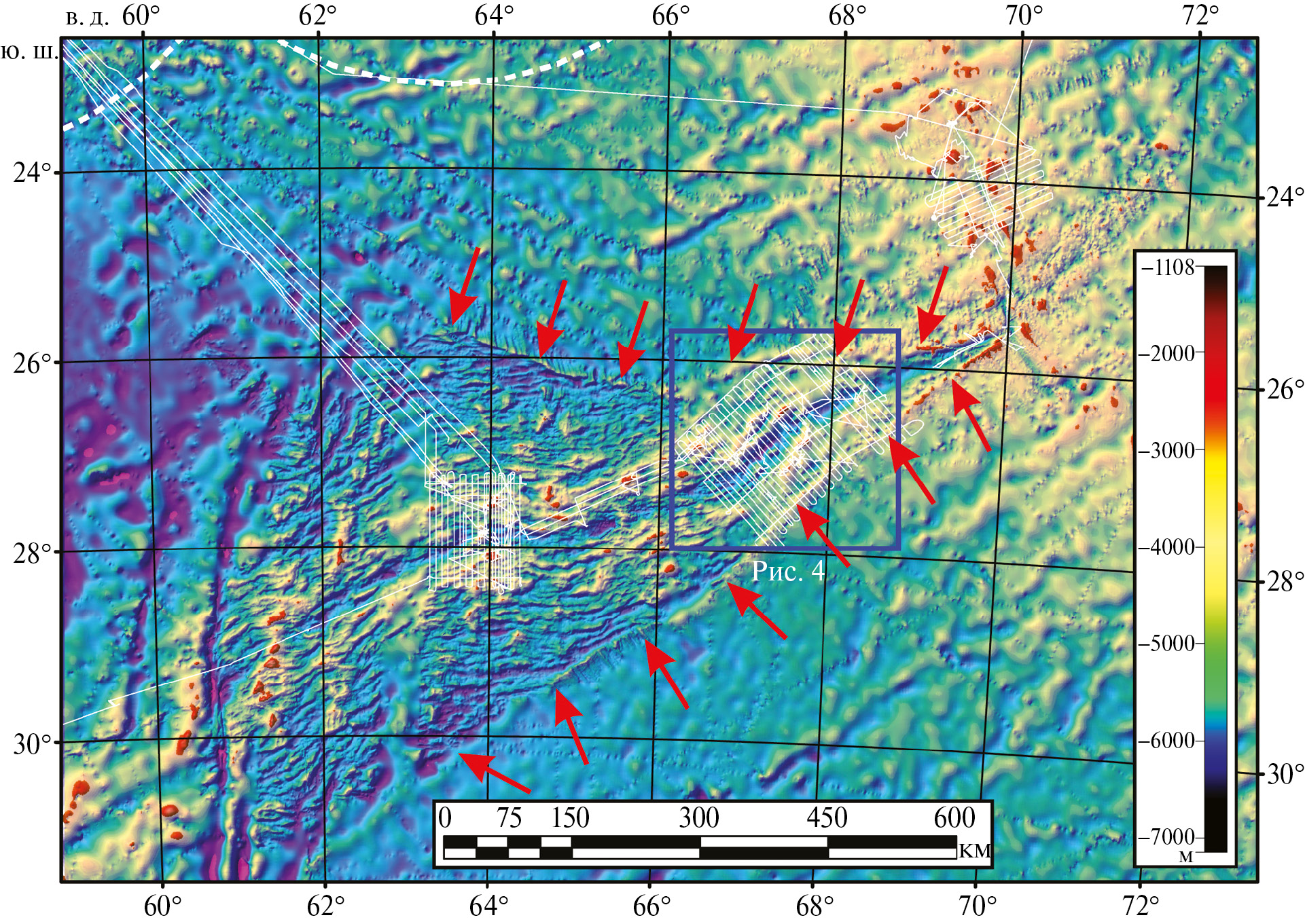 Рис. 3. Рельеф дна восточной части ЮЗИХ по данным [9]. Белые тонкие линии — маршрут 29-го рейса НИС “Академик Николай Страхов” (ГИН РАН, 2012–2013). Белая пунктирная линия — 200-мильная экономическая зона. Синим прямоугольником показано положение планшета на рис. 4. Красные стрелки — абиссальный уступ.