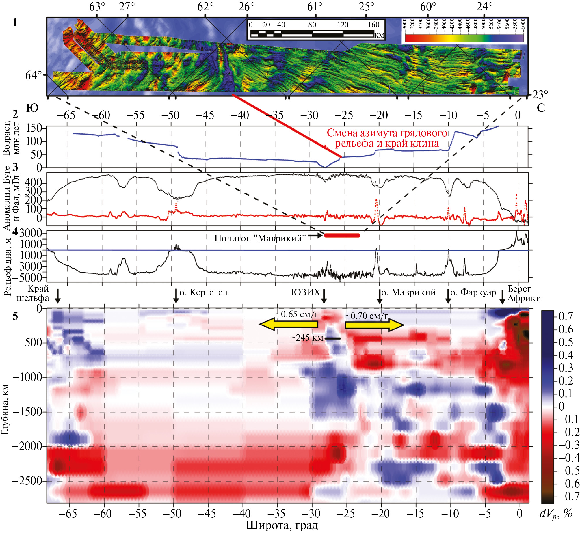 Рис. 5. Корреляция геолого-геофизических данных вдоль регионального субмеридионального профиля, положение которого показано на рис. 1. 1 — оттенённый рельеф полигона “Маврикий” 29-го рейса НИС “Академик Николай Страхов” (ГИН РАН, 2012–2013) по данным цифровой модели на сетке 100 м с указанием его положения в пределах профиля; 2 — профиль возраста фундамента по данным [5] с указанием положения смены азимута грядового рельефа и края клина; 3 — гравитационные аномалии в свободном воздухе (Фая) [14] и аномалии Буге [15]; 4 — рельеф дна [9]; 5 — сейсмотомографический разрез объёмной модели UU-P07 [16], жёлтые стрелки показывают направление дрейфа плит в проекции на плоскость разреза.