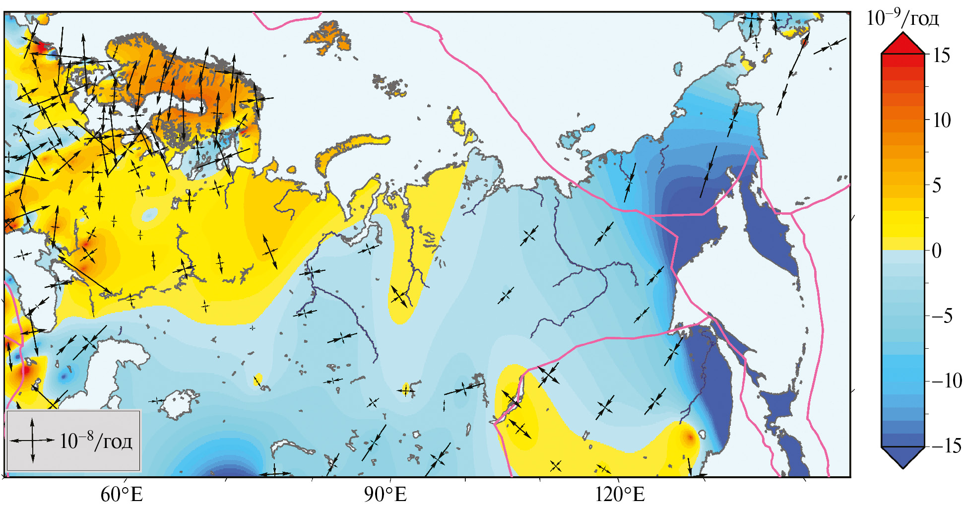 Рис. 1. Стабильность Северной Евразии по данным ГНСС (границы плит – MORVEL56 [2], проекция – коническая Ламберта).