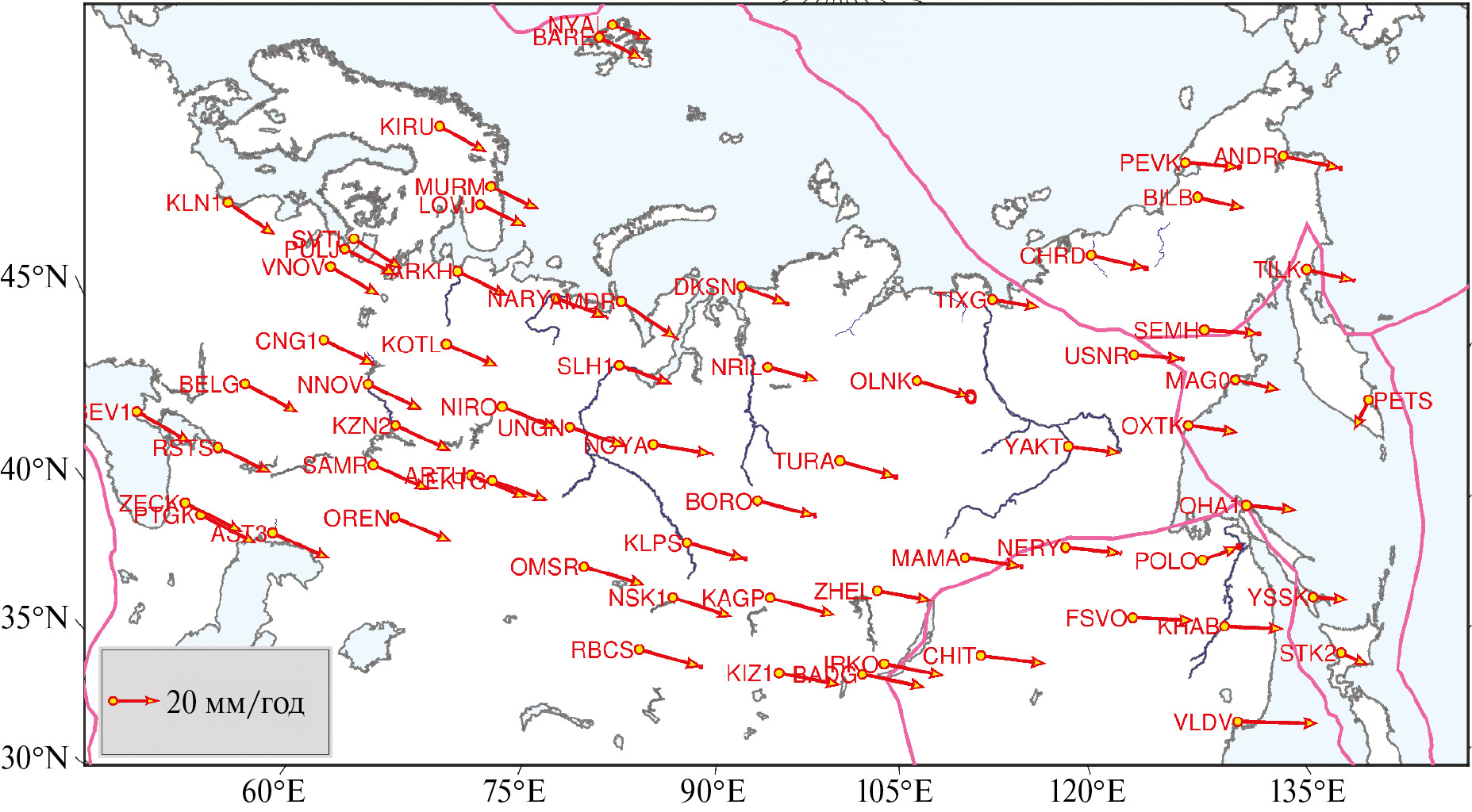 Рис. 4. Активные пункты ГНСС в северной части Евразии (границы плит, проекция — как на рис. 1).