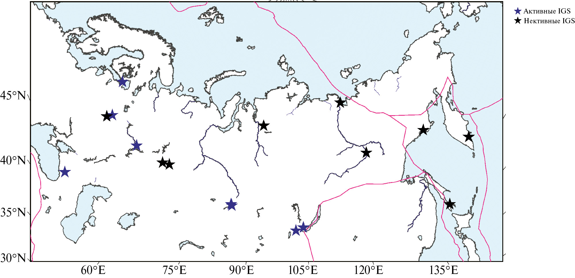 Рис. 3. Пункты IGS в северной части Евразии (границы плит, проекция – как на рис. 1).