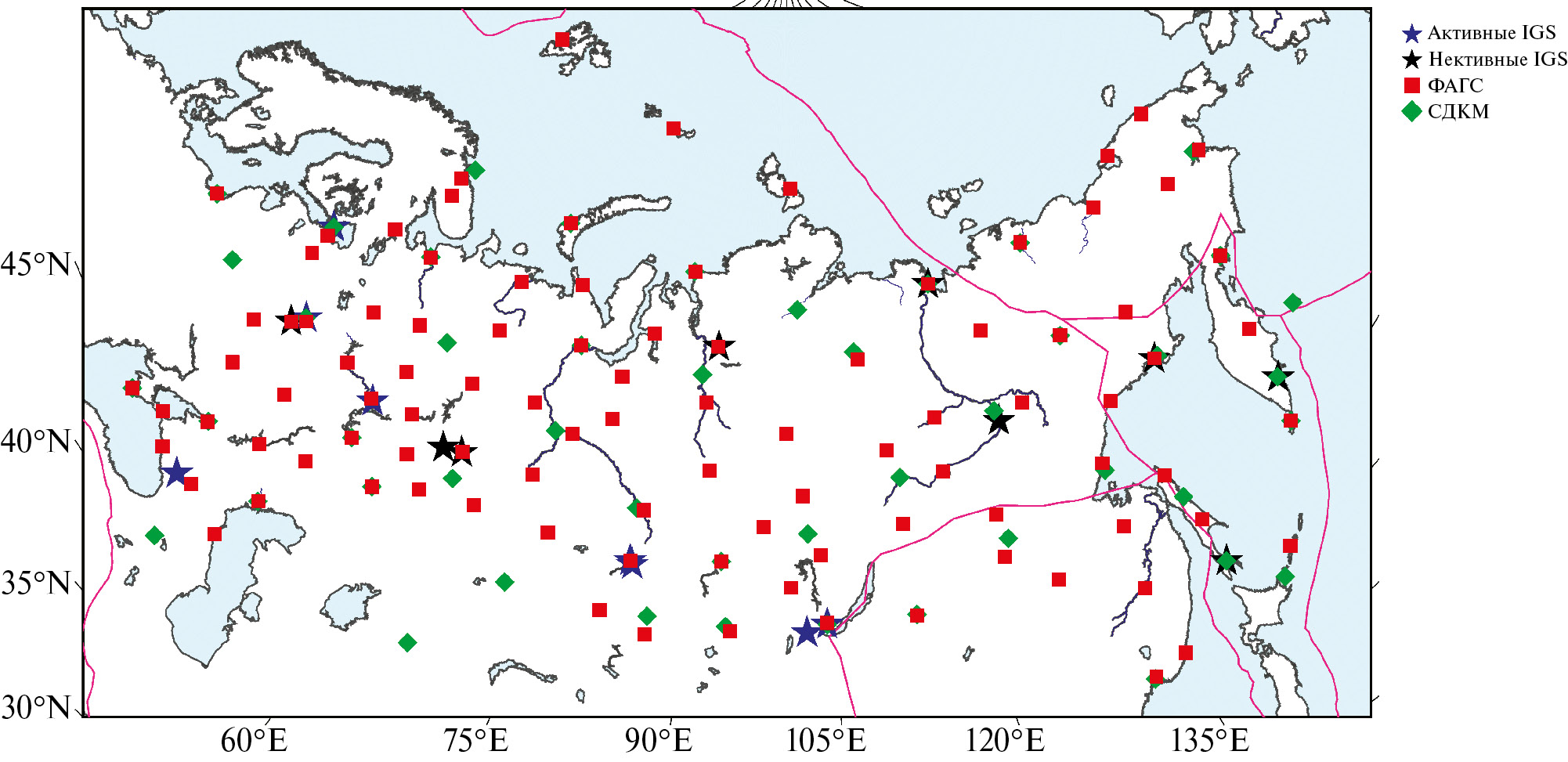 Положительные факторы, позволяющие заместить международную кооперацию в области спутниковой геодезии, состоят в наличии на территории РФ наземных сетей опорных пунктов ГНСС различной ведомственной принадлежности, которые по качеству аппаратуры, методике её установки и эксплуатации, не уступают мировым стандартам, применяемым в IGS (рис. 4). К таким сетям наивысшего качества относятся: фундаментальная астрономо-геодезическая сеть (ФАГС), управляемая ППК “Роскадастр” и сеть базовых станций (БС) системы дифференциальной коррекции и мониторинга (СДКМ-КФД), управляемая АО “Российские космические системы”. Количество продолжительно и непрерывно действующих станций ГНСС каждой из приведённых сетей насчитывает не менее нескольких десятков (при общем наборе из 101 установленных пунктов ФАГС), что, в совокупности, образует значительно более плотное покрытие территории РФ, чем прежняя сеть станций IGS (рис. 3). Результаты анализа данных по этим сетям подтверждают их приемлемость для достижения обозначенных выше целей по обеспечению высокоточной информацией, необходимой для геодинамических исследований.