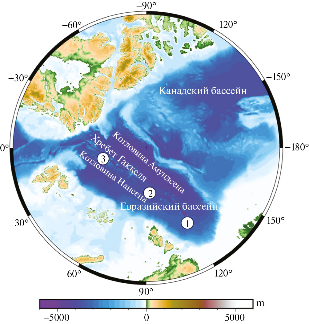 Рис. 5. Глубоководные бассейны Северного Ледовитого океана (сегменты хребта Гаккеля: 1 — восток, 2 — центр, 3 — запад).