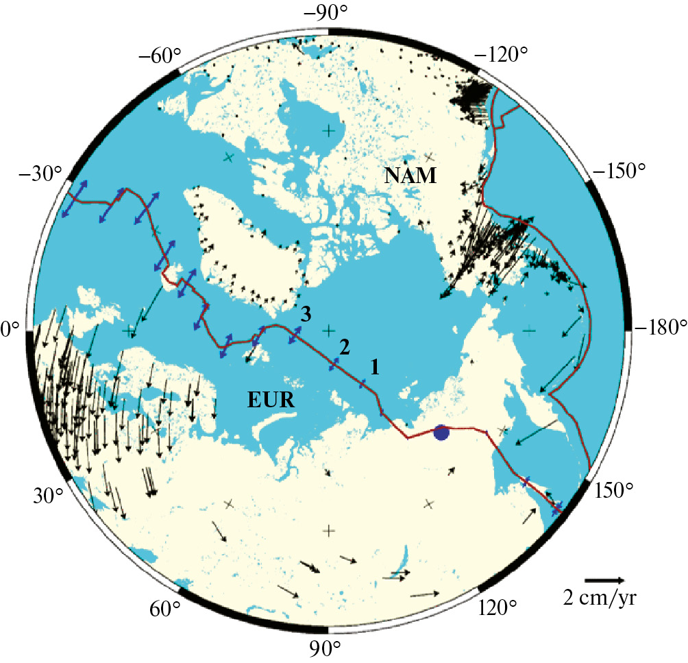 Рис. 6. Конфигурация крупных плит в зоне спрединга (EUR — Евразийская плита, NAM — Северо-Американская плита; 1, 2, 3 — сегменты хребта Гаккеля, как на рис. 5.