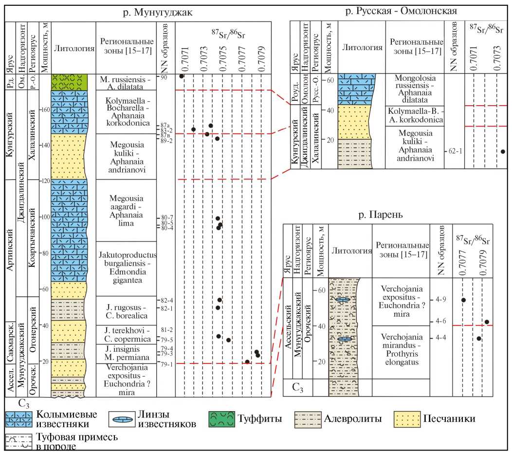 Рис. 2. Стратиграфическое положение отобранных образцов и вариации величины 87Sr/86Sr в раковинах брахиопод нижней перми в разрезах по р. Мунугуджак, р. Русская-Омолонская и р. Парень (Омолонский массив и его юго-восточное обрамление, Северо-Восток Азии)