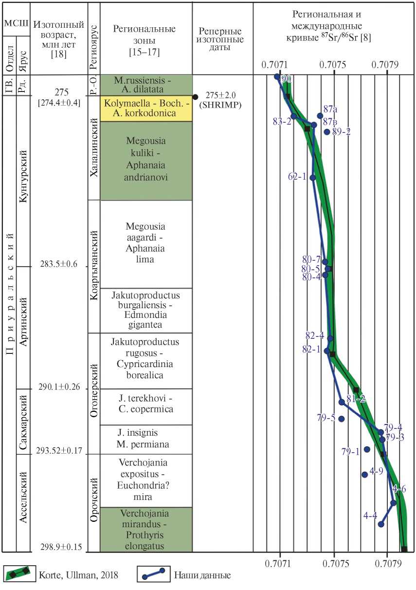 Другой важный вывод, вытекающий из полученных результатов – нами подтвержден раннеартинский возраст региональной зоны Jakutoproductus rugosus – Cypricardinia borealica [19] (см. рис. 4), а не позднесакмарский, как это предполагалось рядом исследователей [20]. Полученные Sr-изотопные данные также хорошо демонстрирует соответствие региональной зоны Megousia aagardi – Aphanaia lima переходным верхнеартинско-нижнекунгурским слоям.