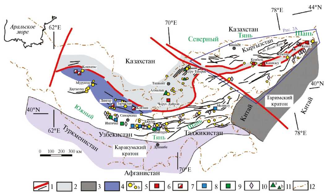 Рис. 1. Схема позднепалеозойского металлогенического пояса Тянь-Шаня. 1 – разломы разных порядков, 2 – позднепалеозойская активная континентальная окраина (Срединный Тянь-Шань), 3 – континентальные блоки основания Таримского и Каракумского кратонов, 4 – террейны аккреционного клина, надвинутые на пассивную континентальную окраину с возможным кратонным фундаментом, 5 – главные (а) и второстепенные (b) месторождения золота, 6 – золото-медно-молибден-вольфрамовые месторождения, 7 – молибден-вольфрамовые месторождения, 8 – полиметально-вольфрамовые месторождения, 9 – олово-вольфрамовые месторождения, 10 – месторождения олова, 11 – главные (а) и второстепенные (b) медно-молибденовые и золото-медные порфировые месторождения, 12 – государственные границы