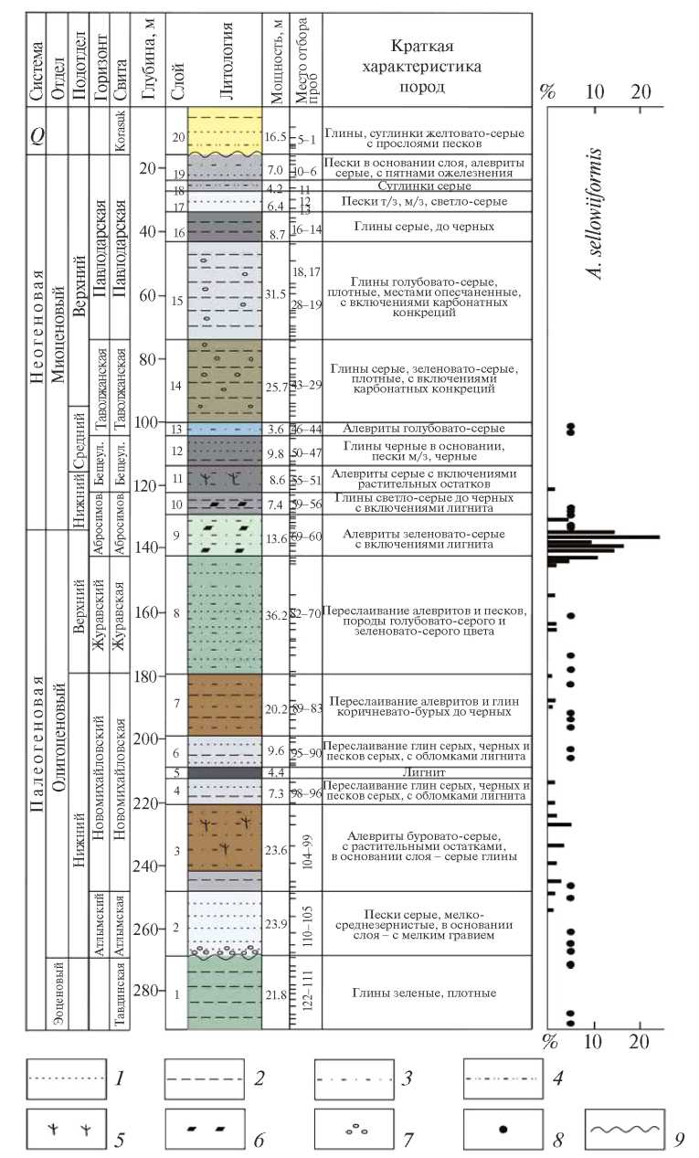 Рис. 2. Распространение пыльцы Abietineaepollenites sellowiiformis (Zaklinskaja) Doweld 2018 в разрезе палеогеновых и неогеновых отложений, вскрытых скв. 2 (пос. Озерянка, Новосибирская обл.). Условные обозначения: 1 — пески, 2— глины, 3 — алевриты, 4 — суглинки, 5 — растительные остатки, 6 — обломки лигнита, 7 — гравий, 8 — содержание компонента менее 1%, 9 — перерыв в осадконакоплении. Сокращения: Карасук. — карасукская свита, Абросимов. — абросимовская свита, Бещеул. — бещеульская свита