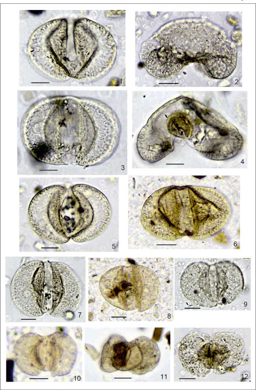 Замечания. Пыльца, воздушные мешки которой крепятся к телу у самого его края, демонстрируют большое сходство с пыльцой Podocarpus andiniformis Zakl. [3], табл. II, фиг. 4. Экземпляры, у которых линии крепления воздушных мешков параллельны, близки к Podocarpus sellowiiformis Zakl. [3], табл. II, фиг. 1. Кроме того, обнаруженная пыльца морфологически близка к ископаемым формам, обнаруженным в палеогене и неогене Западной Европы [7, 8], а также определённо имеет сходство с пыльцой современной Cathaya argyrophylla Chun et Kuang [2]. Все эти палиноморфы объединяют такие признаки, как широкое прикрепление воздушных мешков от самого края тела пыльцевого зерна, а также небольшое расстояние между линиями их прикрепления.