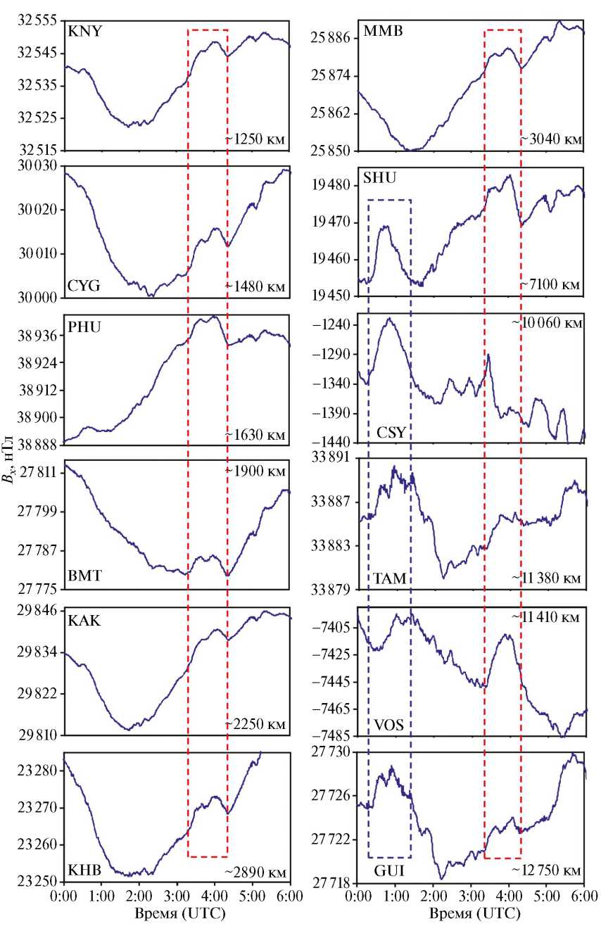 Более сложный отклик демонстрирует основная горизонтальная компонента Bx: возмущения магнитного поля представлены в данном случае двумя ярко выраженными положительными бухтами с максимальной амплитудой ∼10 нТл. Начало возмущений зарегистрировано в ∼00:58 UTC, первый максимум наблюдался в ∼01:30 UTC 03.04.2024 г., второй в ∼04:00 UTC 03.04.2024 г. Характерно, что подобные возмущения компоненты Bx зарегистрированы в ряде обсерваторий международной сети INTERMAGNET. Для примера на рис. 2 представлены записи вариаций магнитного поля в период Тайваньского события, полученные в некоторых обсерваториях сети INTERMAGNET. Обращаясь к данным рис. 2, следует отметить, что возмущения компоненты Вх, проявляющиеся в виде двух положительных бухт, как это наблюдалось в обсерватории MHV, зарегистрированы в обсерваториях, расположенных на расстояниях, превышающих примерно 7000 км от очага основного события 1 из табл. 1. На расстояниях, меньших примерно 3000 км, возмущение компоненты Вх проявляется в виде одной положительной бухты в период времени с ∼ 03:25 до ∼04:25 UTC 03.04.2024 г.