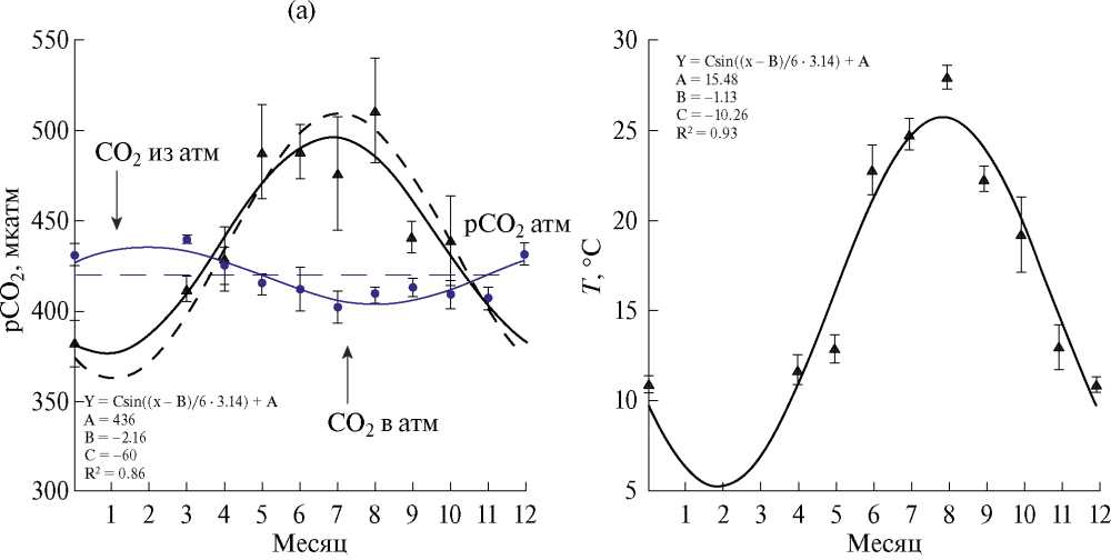 На рис. 2а показан внутригодовой ход рСО2 в поверхностном слое вод (чёрная сплошная кривая), рСО2 в приводном слое атмосферы (синяя сплошная кривая) и рСО2 в поверхностном слое вод с учётом сезонного хода атмосферного рСО2 (чёрная пунктирная линия). По сглаженному профилю синусоиды по данным 2015– 2021 гг. среднегодовое значение рСО2 составляет 436 мкатм (коэффициент А в уравнении на рис. 2а). Внутригодовой диапазон колебаний рСО2 – ± 60 мкатм (коэффициент С в уравнении на рис. 2а). Данные измерений в январе– феврале отсутствуют, однако можно предположить “замыкание” кривой хода рСО2 в синусоиду и его минимальные значения в этот период (рис. 2а).
