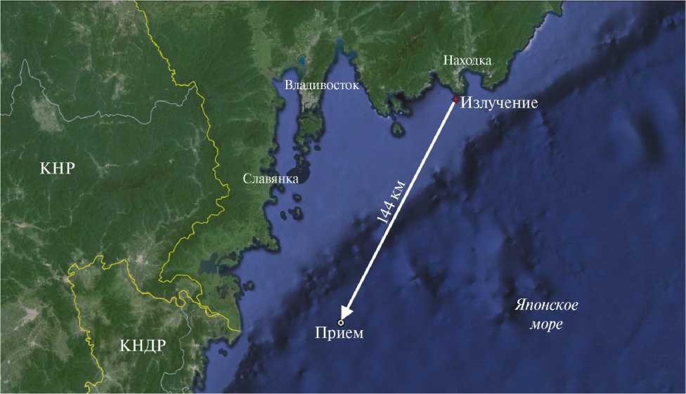 Эксперименты заключались в приёме на различных глубинах сложных фазоманипулированных сигналов, излучаемых источником, расположенном на шельфе, и вычислении импульсных характеристик волноводов путём свертки принятых сигналов с репликой излученного. Методика проведения эксперимента была следующая. В 150 метрах от береговой черты на глубине 25–30 метров (при глубине моря 40 метров) был вывешен с борта судна широкополосный излучатель, соединённый кабелем с бортовым постом управления. Один раз в 6 минут излучался сложный фазоманипулированный сигнал (М-последовательность, 1023 символов, 16 периода несущей частоты на символ) с центральной частотой 400 Гц. Длительность сеансов излучения составила более 12 часов. Условия эксперимента характеризовались наличием протяжённого 60-километрового шельфа и слабым градиентом изменения скорости звука с глубиной на шельфе из-за влияния прошедшего ранее тайфуна “KHANUN”. Схема эксперимента приведена на рис. 1.