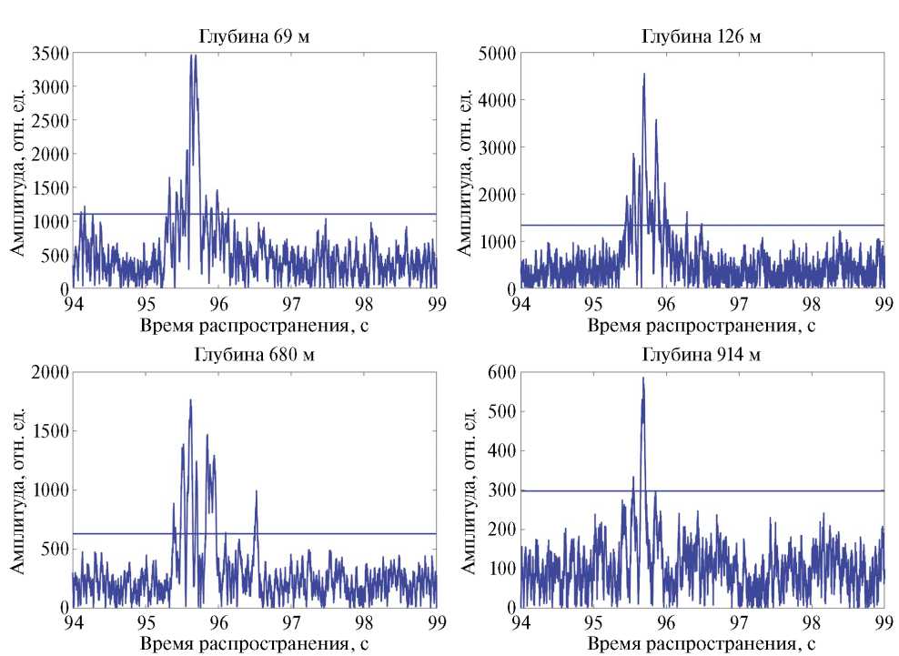 3. Рис. 2. Импульсные характеристики волновода, полученные на горизонтах 69, 126, 680, 914 метров