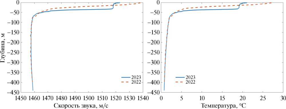 4. Рис. 3. Измеренные CTD-зондом вертикальное распределение скорости звука (а) и температуры (б) по глубине в 2022 и 2023 годах