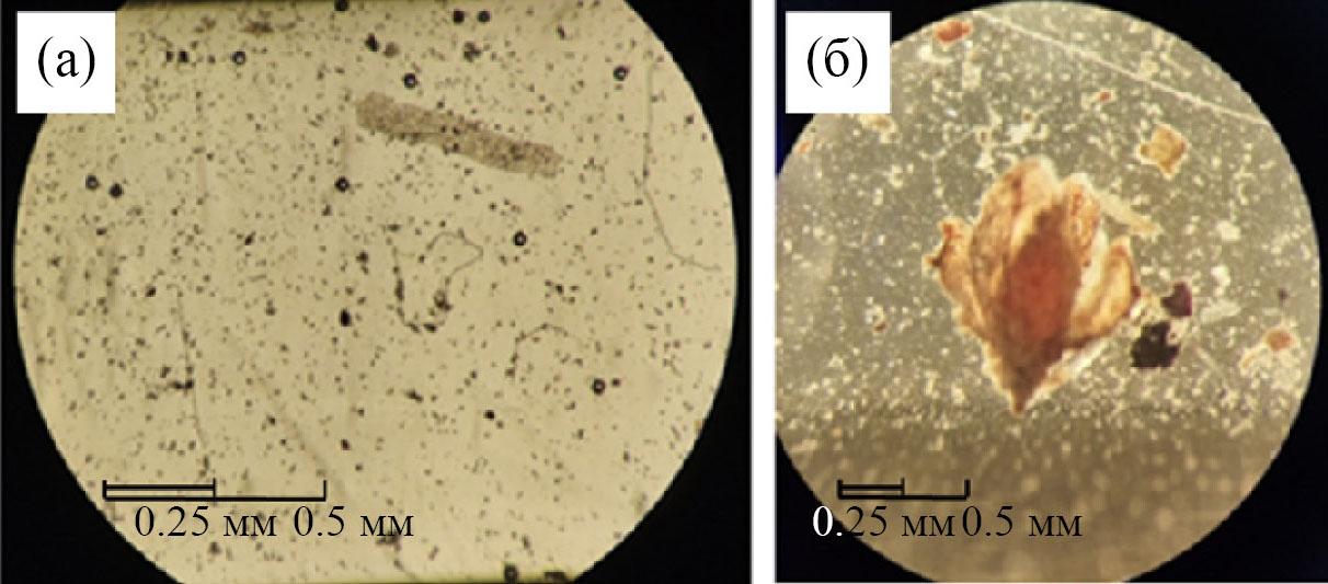 Рис. 5. Растительные остатки в пробе снега, отобранной на территории Пинежского заповедника: (а) – мелкий детрит, растительные волокна; (б) – остатки высшего растения.