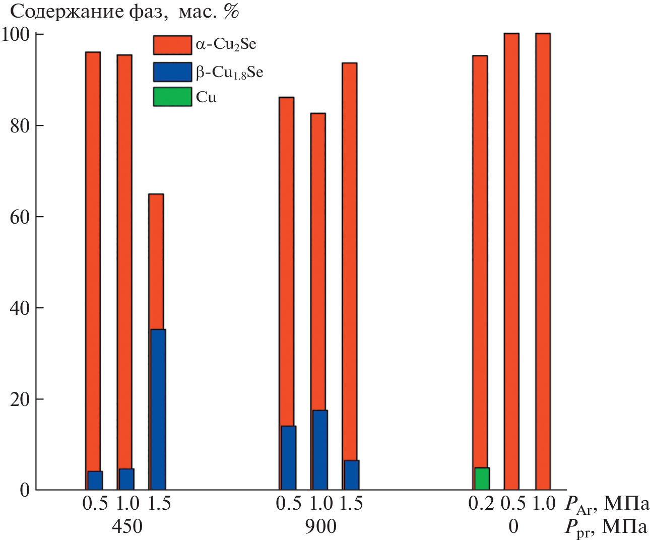 Using the method of self-propagating high-temperature synthesis in the combustion mode, a product based on the α-Cu2Se phase was obtained from a 2Cu + Se powder mixture. The effect of synthesis conditions on the composition of the combustion product was studied and the unit cell parameters of the synthesized phases were determined. It has been established that as a result of combustion of pressed 2Cu+Se mixtures at an Ar pressure of 0.5–1.5 MPa, a product is formed containing two modifications of Cu2Se – low-temperature monoclinic α-Cu2Se and high-temperature cubic β-Cu1.8Se phases. Combustion of a 2Cu+Se mixture of bulk density at an Ar pressure above 0.5 MPa yielded a single-phase product, the monoclinic α-Cu2Se phase.