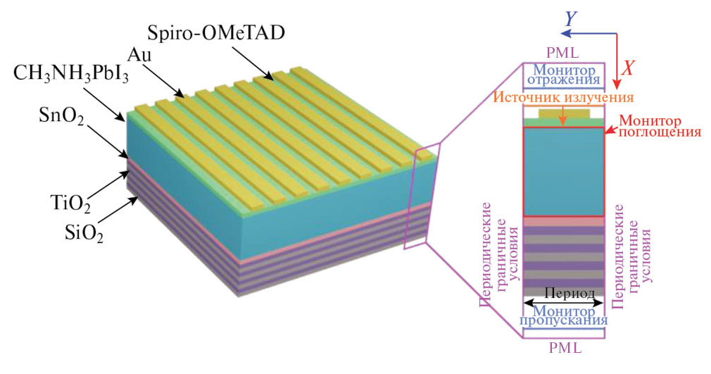 Фотонными кристаллами (ФК) [1] называют среды, в которых показатель преломления изменяется в пространстве с периодом, сопоставимым с длиной волны света. В результате в спектральном составе прошедших через кристалл световых волн образуются пробелы, которые называют запрещенными зонами (ЗЗ). Их появление означает, что в этом спектральном диапазоне свет не может войти в фотонный кристалл или выйти из него в заданном направлении. Фотонные кристаллы легли в основу нанофотонных устройств, таких как миниатюрные лазеры [2], фотодетекторы [3], сенсоры [4]. Кроме этого, фотонные кристаллы активно используются для увеличения эффективности солнечных элементов (СЭ). Это обеспечивается за счет того, что ФК выступает в качестве отражающей подложки. Благодаря высокому коэффициенту отражения в пределах ЗЗ практически 100% излучения, падающего на ФК, отражается и проходит через фоточувствительный слой (ФЧС) повторно, увеличивая эффективность СЭ. В этом случае открывается возможность использования более тонких металлических пленок в качестве контактов и, как следствие, уменьшения нежелательных потерь в СЭ.