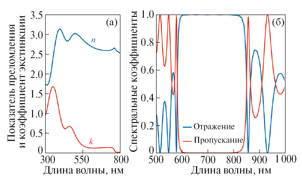 Рис. 2. Зависимости действительной и мнимой части комплексного показателя преломления перовскита MAPbI3 от длины волны (а); спектры отражения и пропускания исходного ФК (б).