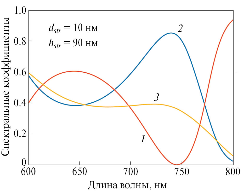 Зависимости коэффициента отражения структуры от длины волны, ширины и толщины нанополосы изображены на рис. 3.