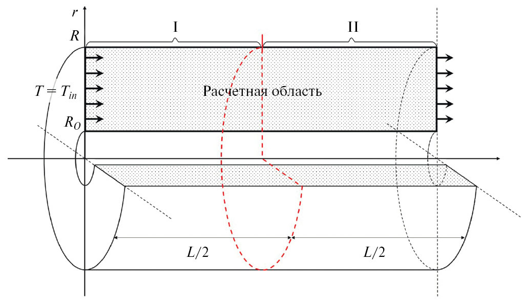 Пусть аномально термовязкая жидкость под действием заданного постоянного перепада давления Δp движется в кольцевом зазоре длиной L, образованном двумя соосными цилиндрами радиусов r0 и R (r0 < R). Втекающая в канал жидкость имеет постоянную температуру Tin. Внешняя и внутренняя стенки первой половины канала поддерживаются при постоянной температуре Twall, а во второй половине канала на стенках задаются условия конвективного теплообмена постоянной интенсивности (рис. 1).