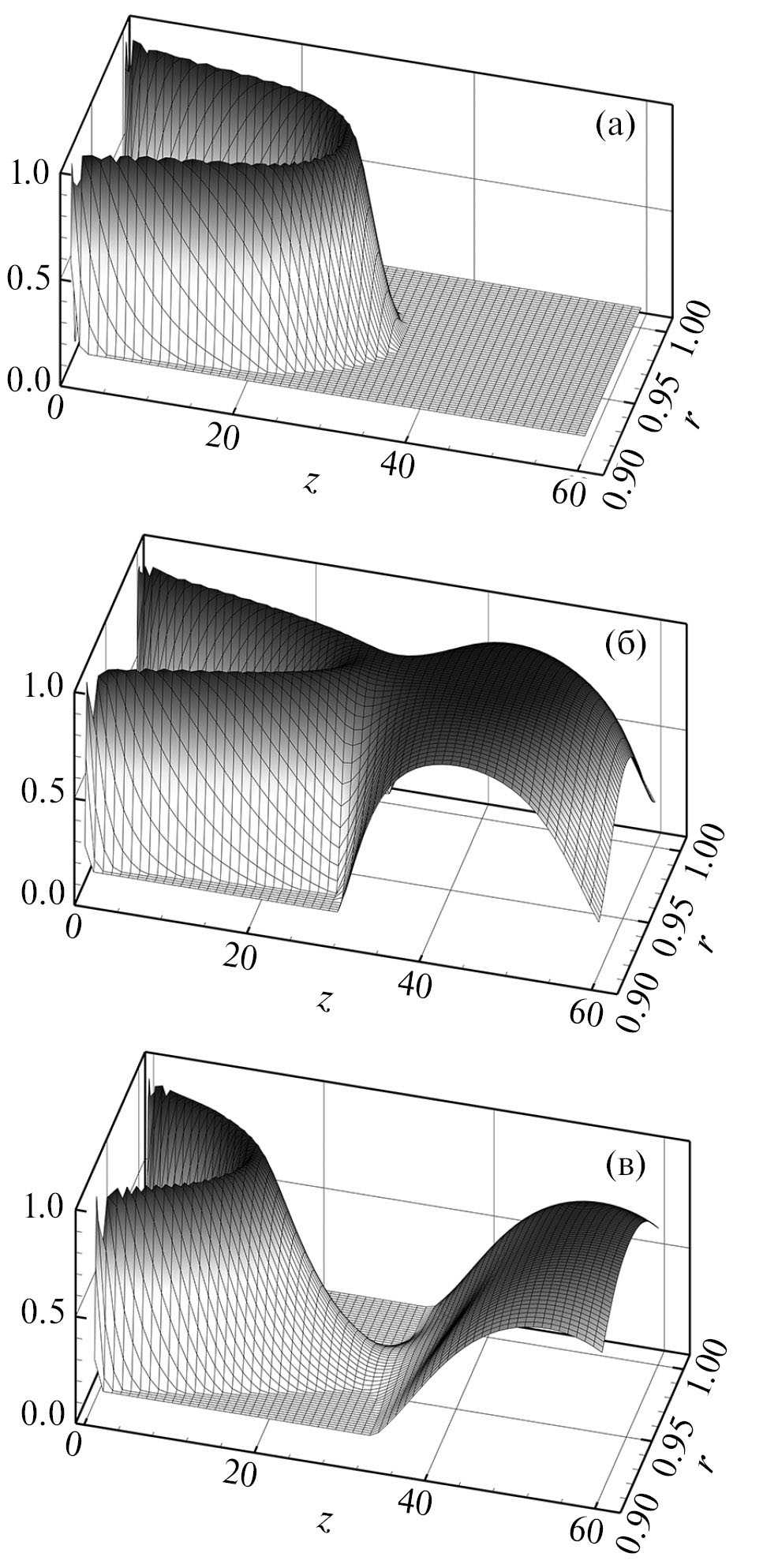 Рис. 2. Характерный вид образующегося в канале вязкого барьера в последовательные моменты времени (Re = 600, Pe = 6000, Nu = 5, L/R = 60, r0/R = 0.9, β = 0.05).