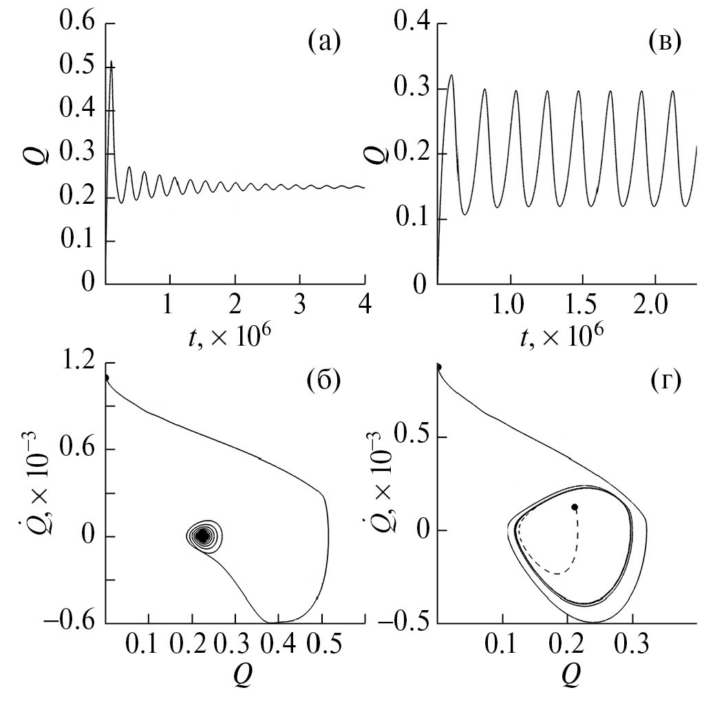 Рис. 3. Изменение расхода жидкости и соответствующие фазовые траектории в режиме затухающих (а, б) и незатухающих (в, г) колебаний. Точками на фазовых портретах отмечены начальные состояния системы.