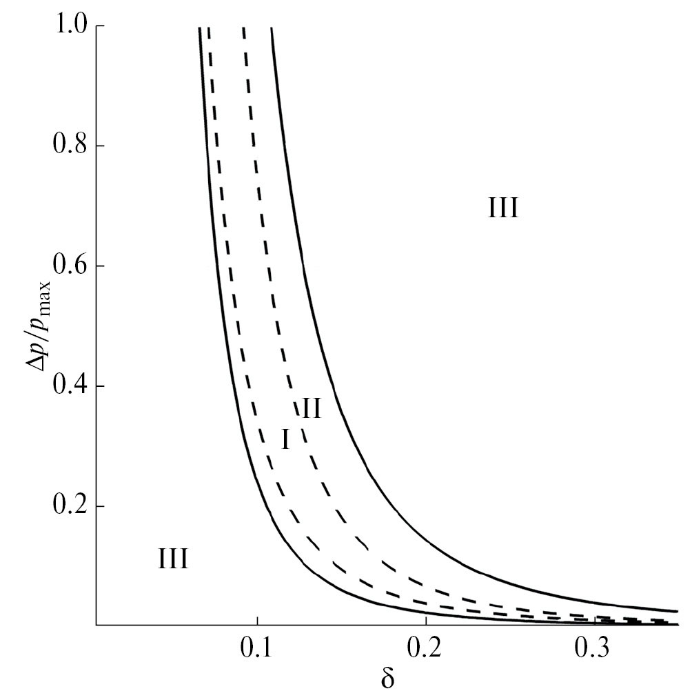 Для идентификации динамических режимов изменения расхода аномально термовязкой жидкости при течении в кольцевом канале были проведены параметрические исследования для различных значений перепада давления ∆p и геометрического параметра , равного отношению ширины кольцевого зазора к радиусу внутреннего цилиндра. В результате на координатной плоскости были построены области затухающих и незатухающих колебаний расхода аномально термовязкой жидкости (рис. 4).