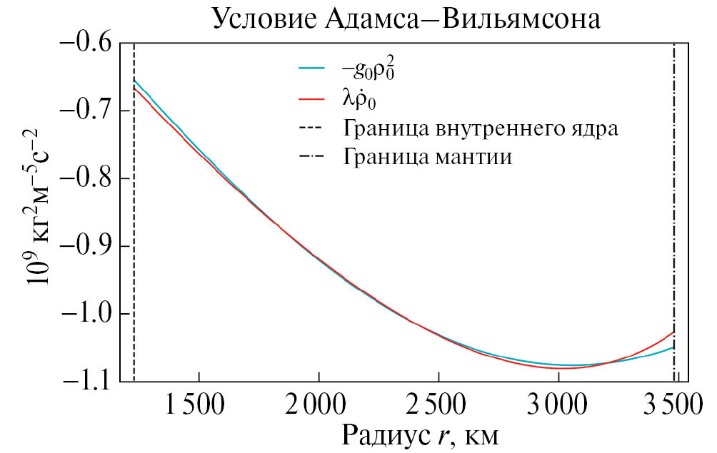 Рис. 1. Сравнение величин и во внешнем ядре. Условие Адамса–Вильямсона не выполняется у границы внутреннего ядра и у границы мантии.