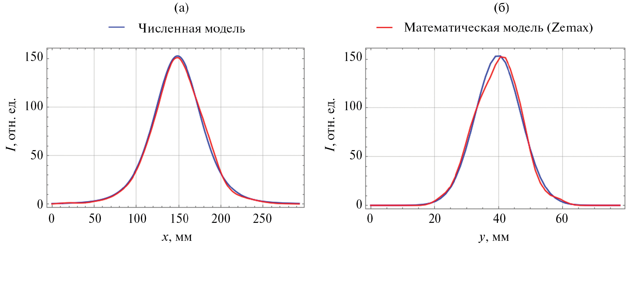 где m – расстояние от источника до экрана, α0 и β0 – углы расходимости излучения по быстрой и медленной осям в модельной функции (3) для оценки расходимости излучения методом наименьших квадратов (МНК). Сопоставляя распределение I(x,y), полученное в моделировании, с выражением (3), с помощью МНК рассчитаны параметры направленности излучения I(θx, θy), а именно углы расходимости α0 и β0 (аппроксимация данных): α0 = 39.9° и β0 = 9.9°, которые близки к значениям α0 = 40° и β0 = 10°, задаваемым в программе Zemax в качестве исходных параметров модели массива диодов. Для сравнения модельной функции (3) и параметров, полученных на основе МНК, с данными численного эксперимента проведено сопоставление серединных горизонтальных (рис. 2а) и вертикальных (рис. 2б) сечений пространственных распределений интенсивности пятна излучения: полученное в численном эксперименте (Zemax) и рассчитанное модельной функцией (3) и МНК.