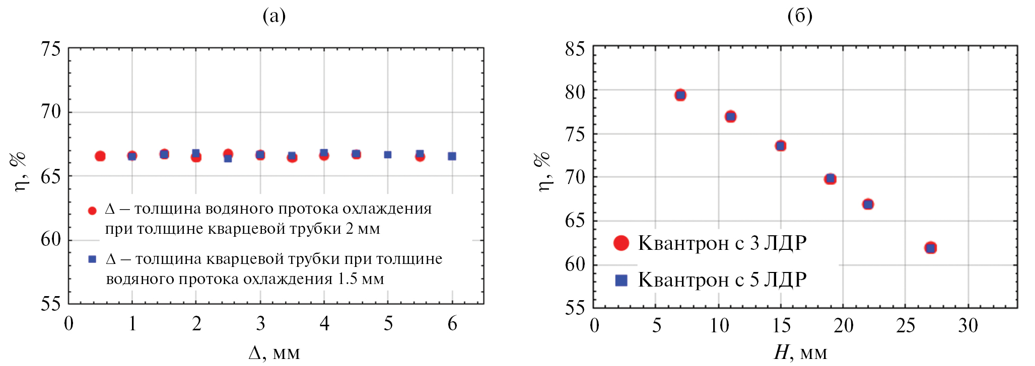 Рис. 9. Значения эффективности накачки активного элемента при различных значениях Δ – толщин жидкостного протока и кварцевой трубки (а); Н – расстояния между лазерными диодными решетками (б).