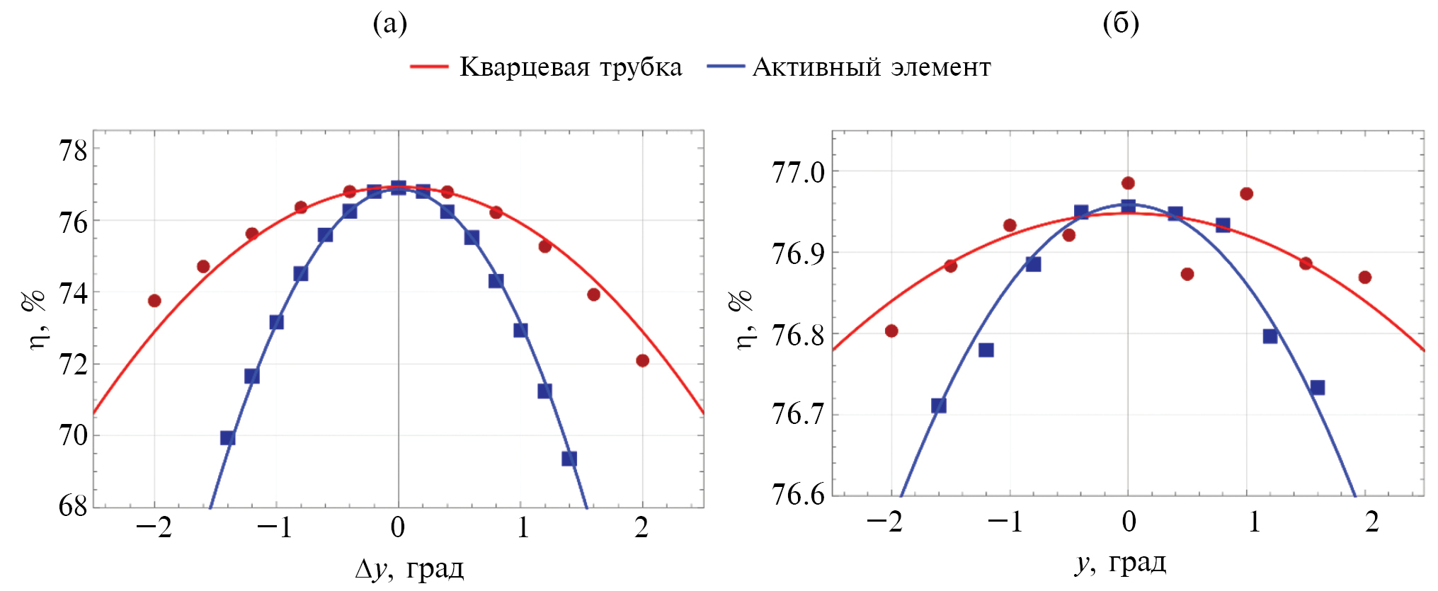 где ∆ – смещение вдоль оси y (∆ = ∆y) или угол поворота относительно центра активного элемента вокруг оси y (∆ = γ), ηmax – значение эффективности накачки при отсутствии смещения и поворота активного элемента или кварцевой трубки (∆ = ∆y = γ = 0), ∆0 – значения смещения по оси y (∆0 = ∆y0) или угол поворота относительно центра активного элемента вокруг оси y (∆0 = γ0), при котором эффективность накачки активного элемента уменьшается на ∆ηнак = 1%. Данная функция подходит для расчета эффективности накачки как при смещении, так и при повороте активного элемента и кварцевой трубки с учетом соответствующих параметров, значения которых представлены в табл. 2.