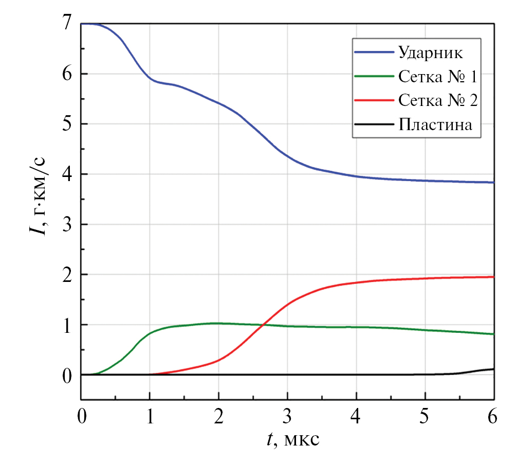В качестве интегральной характеристики процесса взаимодействия ударника и элементов экрана рассчитаны нормальные компоненты полного импульса каждого из тел, временные профили которых приведены на рис. 3 для начальной скорости удара 7 км/с. Как видно из рис. 3, взаимодействие (передача импульса) ударника с первой сеткой в основном завершается к моменту t = 1 мкс, при этом ударник фрагментируется и образует облако осколков. Вследствие большей площади взаимодействия эффективность передачи импульса от ударника ко второй сетке более чем в 2 раза выше, чем к первой. Завершается взаимодействие со второй сеткой к моменту времени t = 4 мкс. Заметная передача импульса к пластине-детектору начинается с момента времени после t = 5 мкс. К этому времени облако осколков уже имеет увеличенные размеры и соответственно меньшую плотность, что снижает возможность пробития преграды.