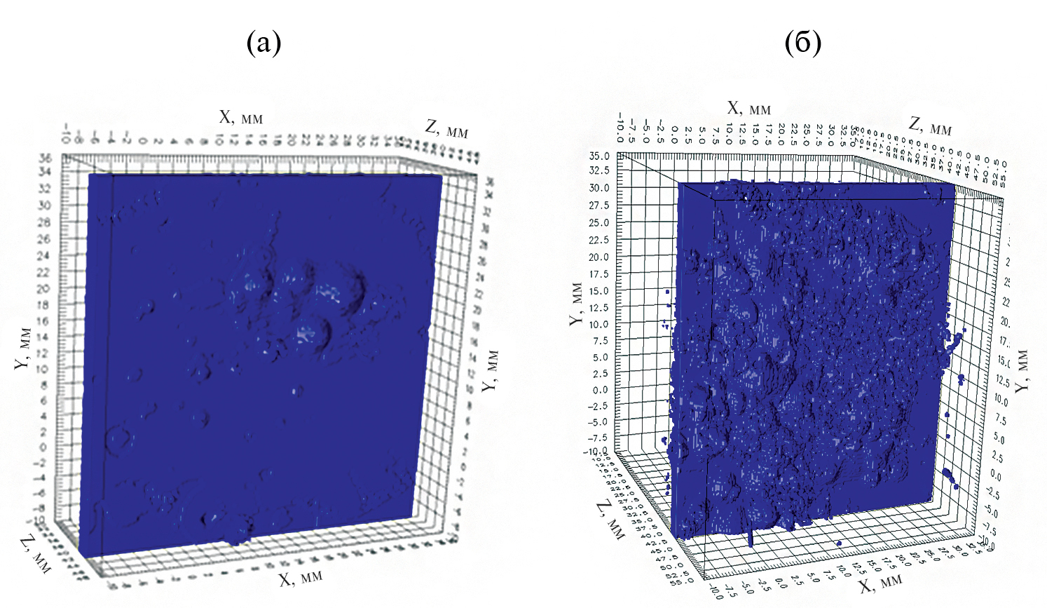 На рис. 1 показаны расчетные конфигурации взаимодействующих тел при начальной скорости ударника 10 км/с в моменты времени t = 0, 10, 20 и 30 мкс. Из анализа результатов расчета видно, что начиная с момента времени t = 28 мкс начинается взаимодействие частиц осколков ударника и защитной сетки с алюминиевой пластиной-детектором. В ходе процесса сеточная конструкция фрагментирует ударник (на рис. 1 показан синим цветом) на отдельные конгломераты осколков, которые продолжают дробиться и рассеиваться далее. Анализ расчетного поля плотности показал, что головная часть облака осколков состоит преимущественно из низкоплотных частиц алюминия и хондрита с ρ < 2 г/см3. Так, на рис. 2 представлено расчетное 3D-поле плотности в момент времени t = 40 мкс: отдельно для облака низкоплотных осколков с ρ = 0.01–2 г/см3 (рис. 2а) и для диапазона плотностей ρ = 2–3 г/см3 (рис. 2б). Такое распределение плотности в облаке способствует более сглаженной по времени передаче нагрузки на защищаемый объект, чем в случае прямого удара без защитного сеточного экрана.