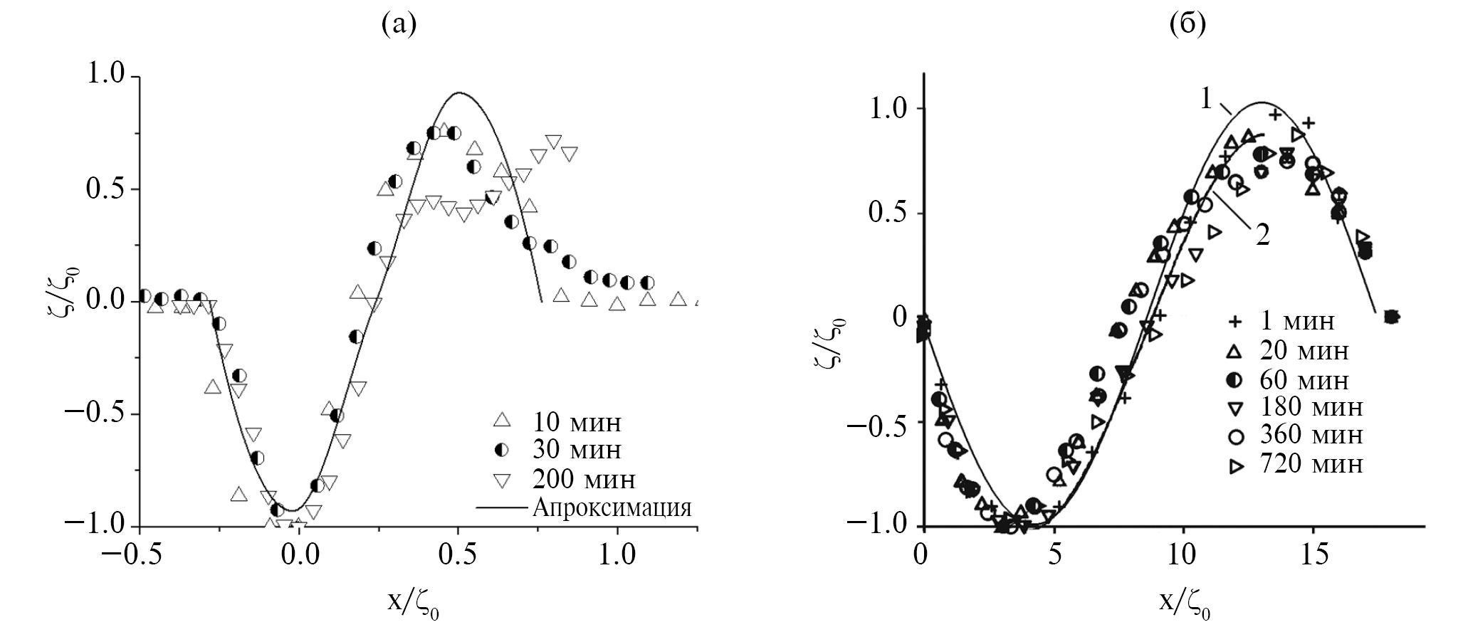 Физически величина q равна крутизне донной волны и по данным экспериментов различных русловых процессов является постоянной величиной. Например, по данным экспериментальных кривых для эволюции донной поверхности под трубой на дне реки q = ζ0 / λ = 0.08 (рис. 1а [11]). Другой пример эволюции донной поверхности под воздействием плоской придонной струи (течение из-под щита), по данным работы [6], изображен на рис. 1б. Из него видно, что для шести различных моментов времени сохраняется синусоидальная форма донной поверхности, меняются длина и амплитуда донной волны, а их отношение остается постоянным.
