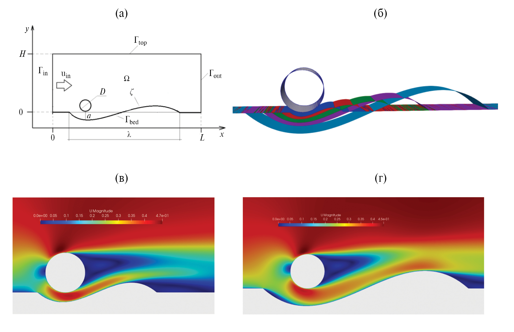 4. Fig. 3. Statement of the problem of flow past a cylinder: a – scheme of the computational domain. Гin – input boundary, Гout – output boundary, Гbed – bottom boundary, Гtop – upper boundary; b – shapes of the bottom surface; results of calculation of flow past a cylinder over bottom waves: c – 3D wavelength; g – 6D wavelength.
