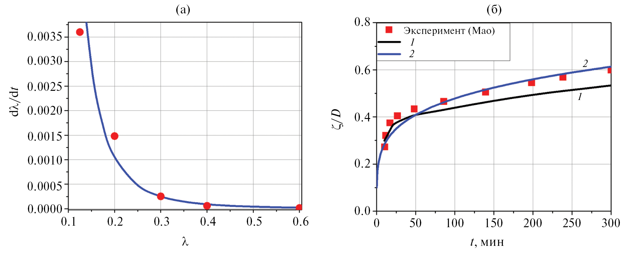 Методом наименьших квадратов из системы уравнений (10) находим коэффициенты интерполяционной функции λ˙=Aλn lnA = −12.47, A = 0.00000385, n = 3.42. Сравнение интерполяционной кривой λ˙=Aλn с представленными в табл. 1 красными точками приведено на рис. 4а. Решение определяется по формуле (11). Подставляя найденные значения A, n, получим