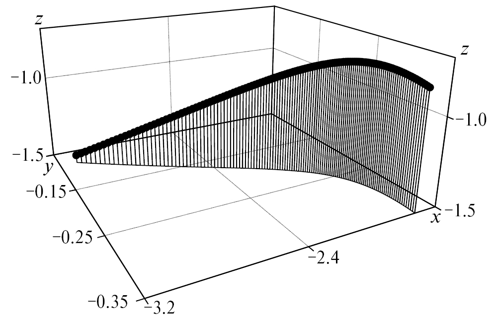 Вычисления с учетом формул (31) и начальных условий (32) были проведены для случая, когда нужно обеспечить вращение вокруг постоянного единичного вектора ρ=(0.6000; 0.1000; 0.7937) с постоянной угловой скоростью ω = 2 в течение 1/4 с. На рис. 1 показана траектория подвижной материальной точки в системе отсчета, жестко связанной с твердым телом. Положения материальной точки показаны с шагом 0.002 по времени. Она движется справа налево.