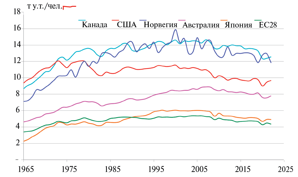Избранные для исследования страны являются ключевым элементом современного постиндустриального общества, характеризуемого насыщением энергопотребления (рис. 1), когда приходящееся на душу населения потребление первичной энергии (нефть, газ, уголь, электроэнергия ГЭС, АЭС и ВИЭ) стабилизировалось на уровнях, в основном определяемых природно-географическими условиями [22]. Более того, в последние 15–20 лет во всех исследуемых странах наблюдается даже некоторое снижение этого показателя, вызванное не только структурными изменениями в экономике, повышением энергоэффективности, но также климатическими изменениями, в результате которых в странах умеренного и холодного климата происходит уменьшение затрат энергии на отопление.