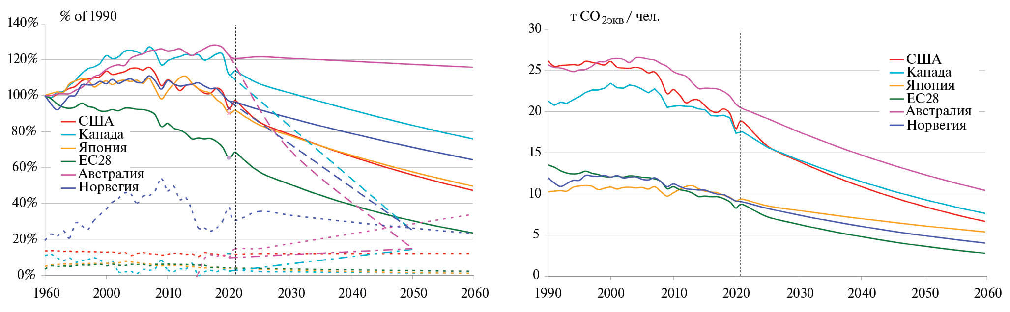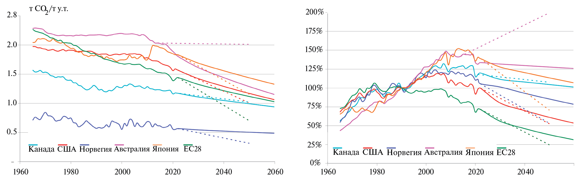 Рис. 3. Изменение удельной (а) и валовой (б) энергетической эмиссии CO2 по данным [21] с экстраполяцией, выполненной с темпами изменения последних 25 лет («инерционный» сценарий), а также сценарий STEPS МЭА [23] для ЕС, США и Японии, национальные программы Канады [24], Норвегии [25] и Австралии [26] (штриховые линии).